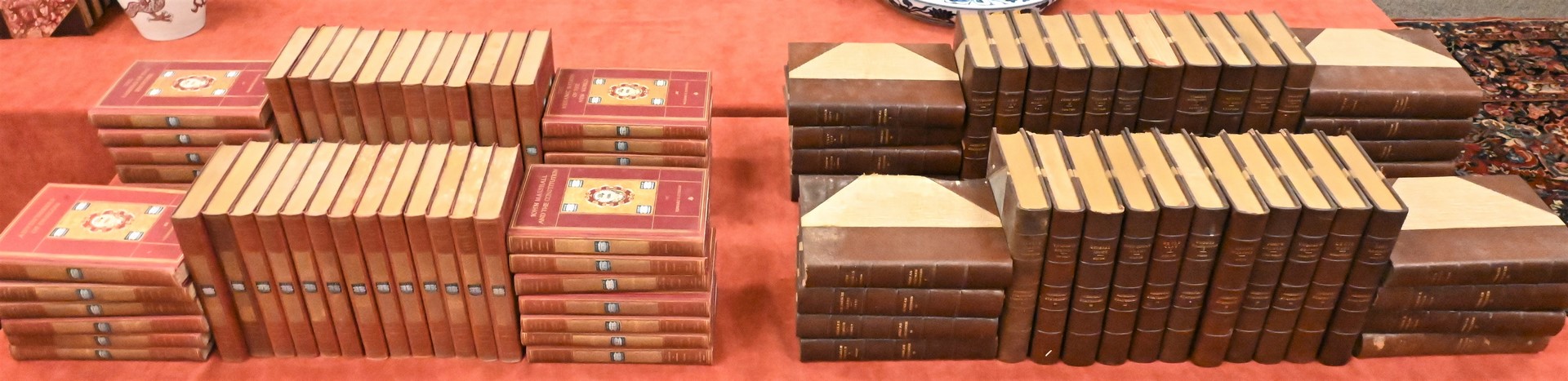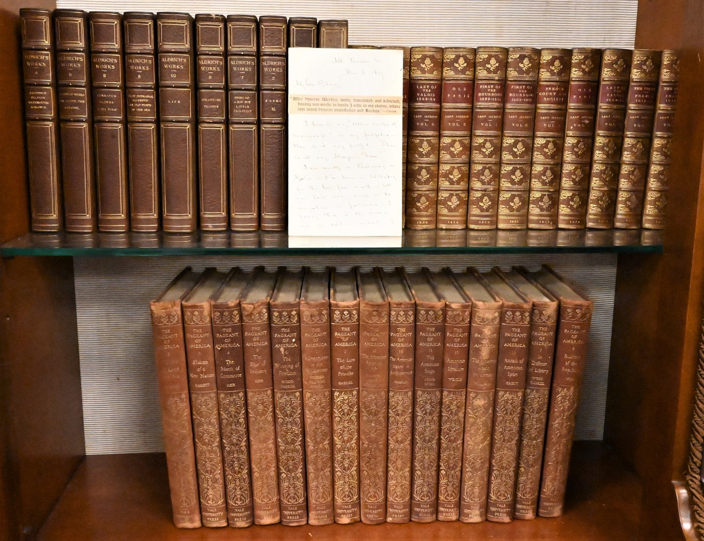 Three Sets of Leather Bound Books, to include 15 volumes of “The Pageant of America”, limited edition #885/1500, published in 1926; 10 volumes of “Aldrich’s Works”, limited edition #216/250, published in 1908 with first volume containing a letter from Thomas Aldrich, along with 11 volumes of Lady Jackson, Provenance: Estate of Cyril H. Moore Jr, Kent, Connecticut.