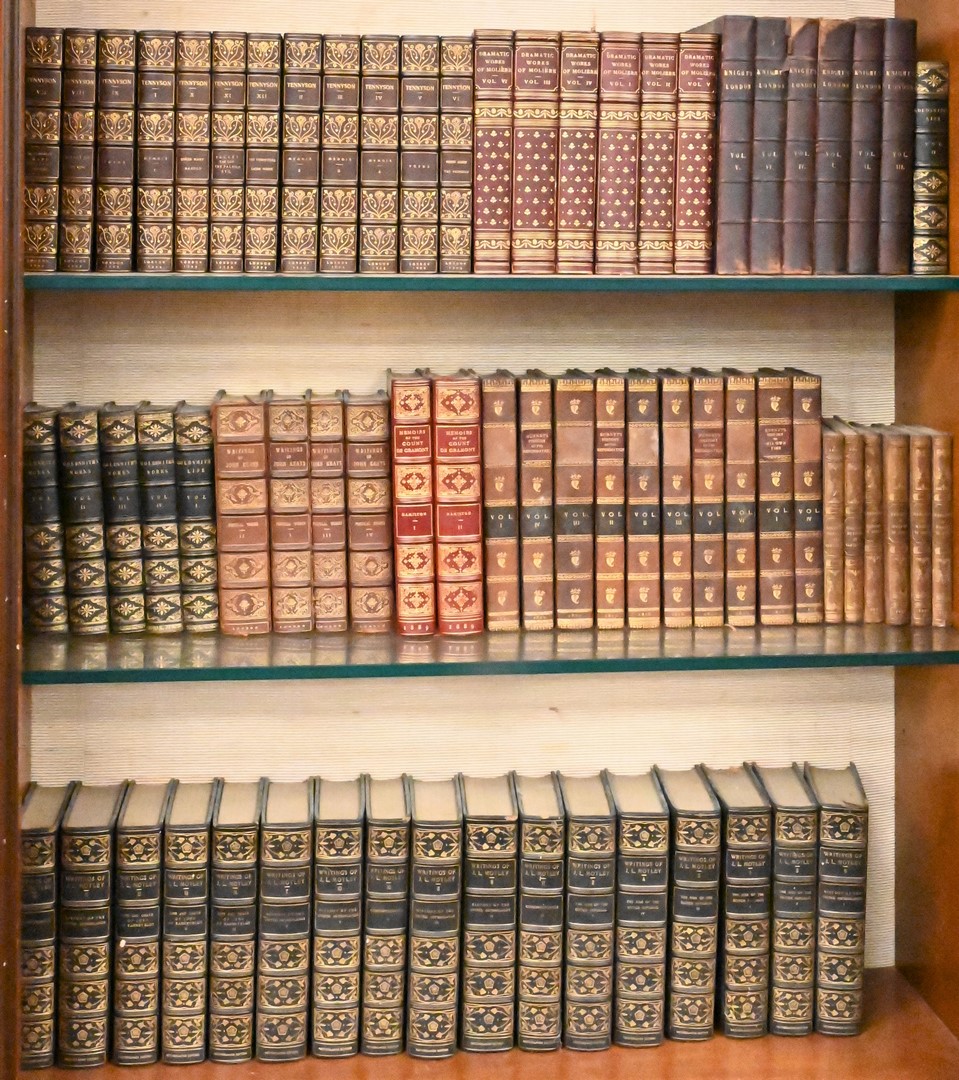 Approximately 69 Leatherbound Books, to include a complete 12 volume set of Alfred Tennyson’s works, 10 volumes of Burnet’s History of the Reformation, 17 volumes of “Writings of J. L. Motley”, etc.., Provenance: Estate of Cyril H. Moore Jr, Kent, Connecticut.