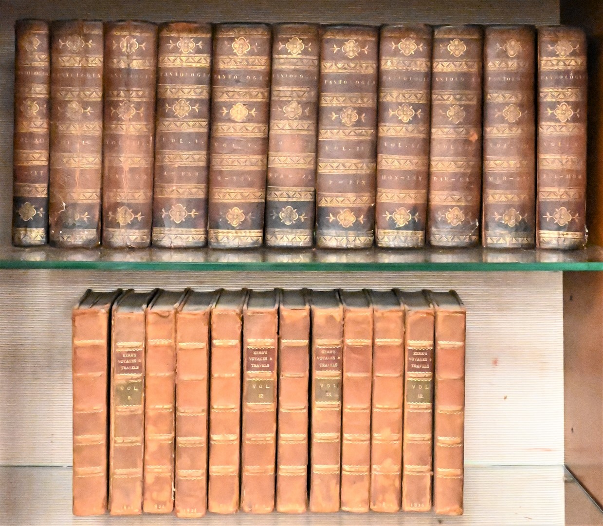 Two Sets of Leather Bound Books, to include 12 volumes of Robert Kerr’s “A General History and Collection of Voyages and Travels”, published in 1824; along with 11 volumes of “Pantologia: A New Cyclopaedia”, published in 1813, Provenance: Estate of Cyril H. Moore Jr, Kent, Connecticut.