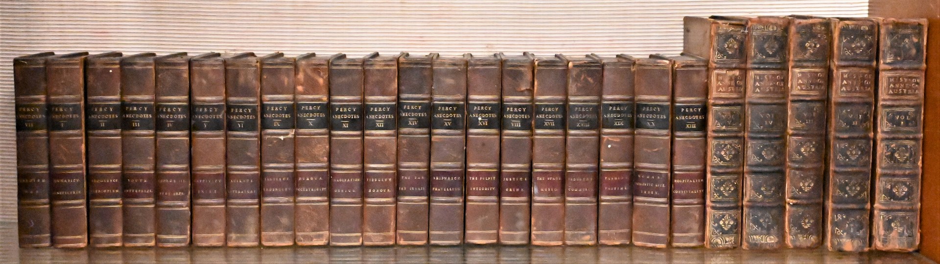 Two Sets of Leather Bound Books, to include a complete five volume set of “Memoirs for The History of Anne of Austria”, published in 1726; along with a complete 20 volume set of “The Percy Anecdotes” by Sholto and Reuben Percy, published in 1823, Provenance: Estate of Cyril H. Moore Jr, Kent, Connecticut.