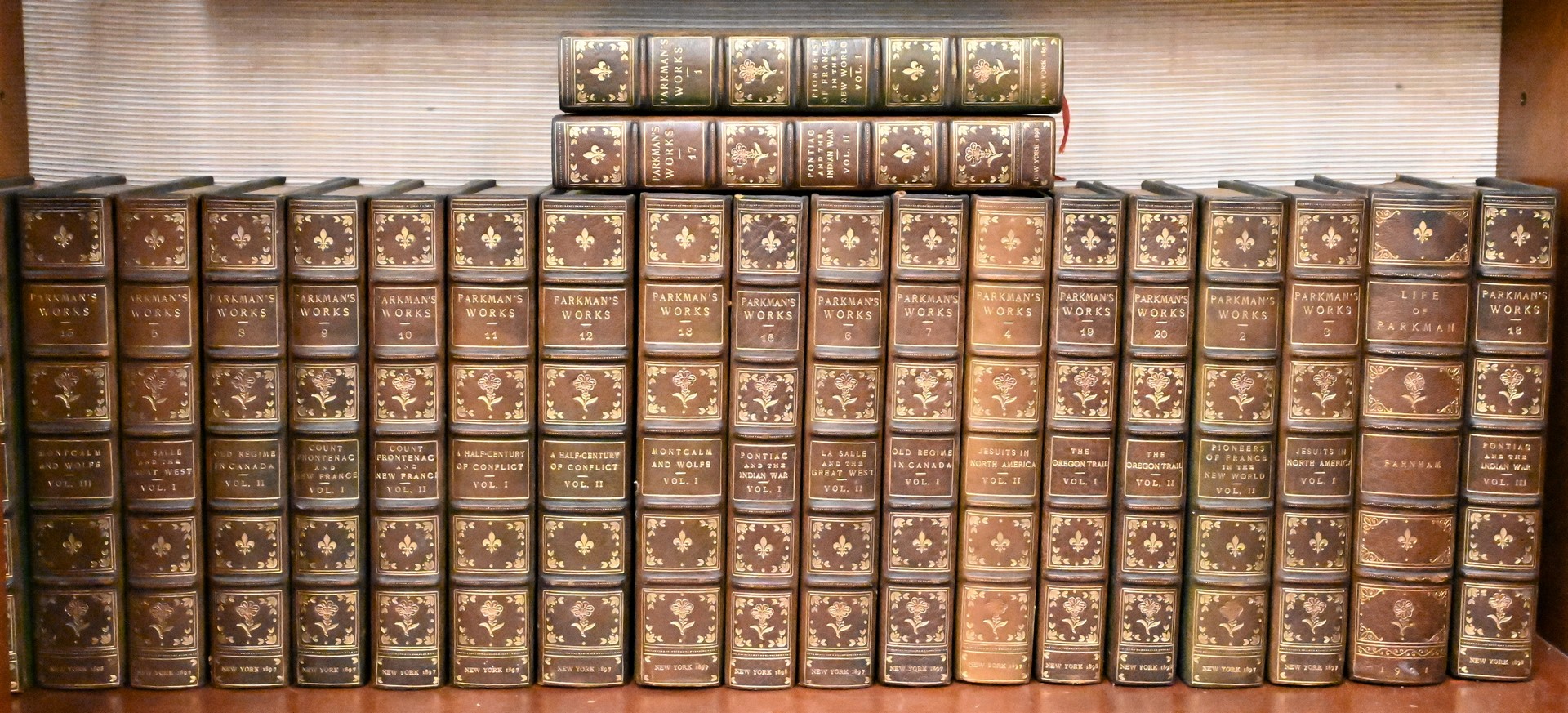 21 Volume Leather Bound Set of “Parkman’s Works”, limited edition #224/300, authored by Francis Parkman and published in 1897; along with a letter signed by Parkman referencing a conversation with Mr. Coolidge who could possibly be Calvin Coolidge, the 30th president of the United States of America, Provenance: Estate of Cyril H. Moore Jr, Kent, Connecticut.