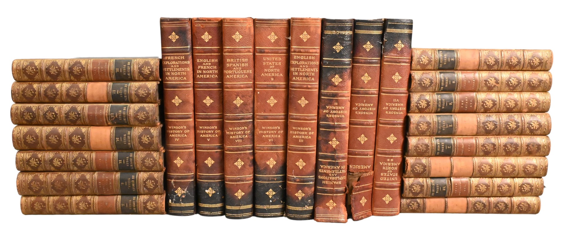 Two Sets of Leather Bound Books, to include a complete first edition “Windor’s History of America” comprised of eight volumes, published in 1886, along with complete set of “De Quincey’s Works” comprised of fifteen volumes, Provenance: Estate of Cyril H. Moore Jr, Kent, Connecticut.