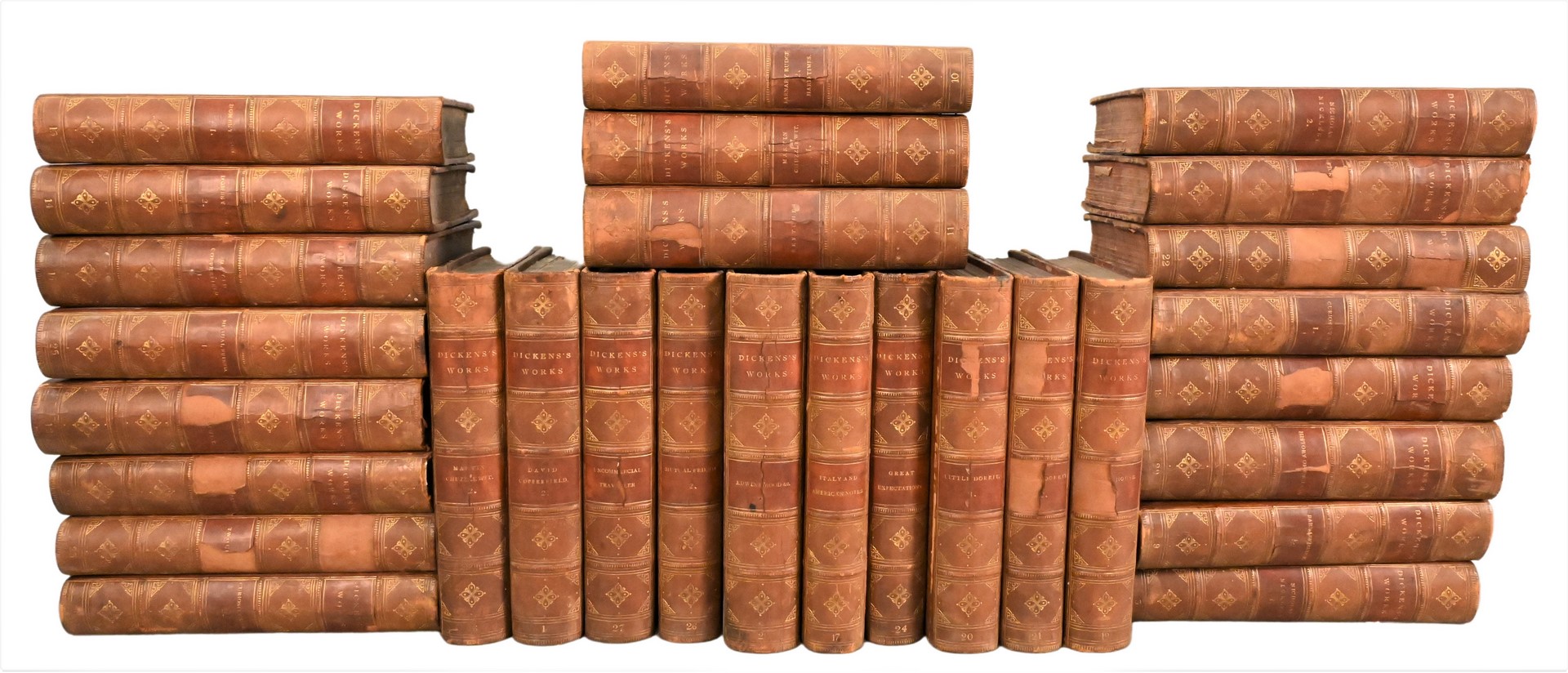 Complete Set of 29 Volumes of Leatherbound “Works of Charles Dickens – Library Edition” Books, published in 1870’s, Provenance: Estate of Cyril H. Moore Jr, Kent, Connecticut.