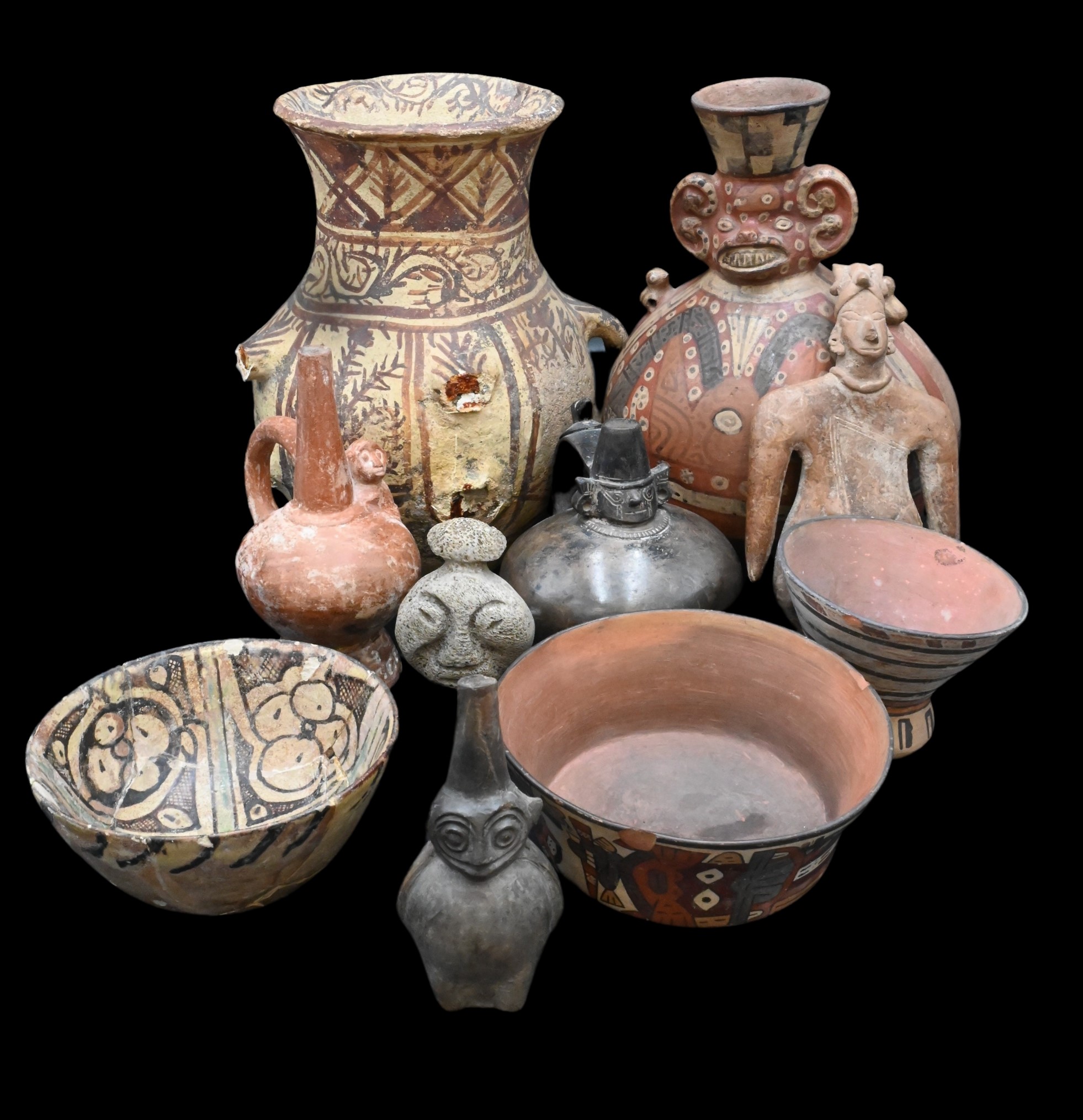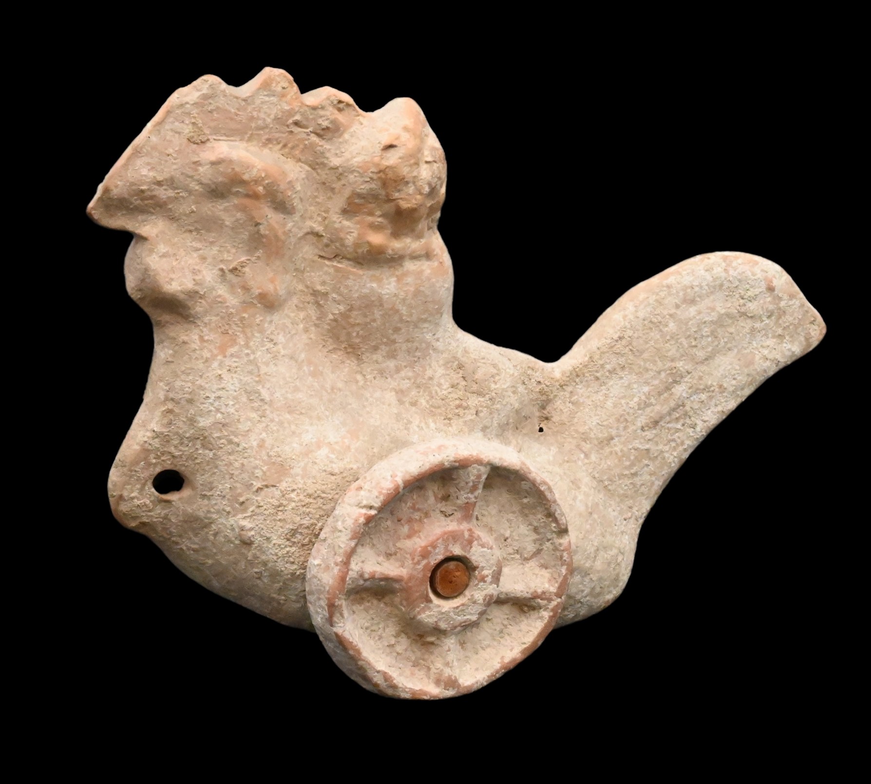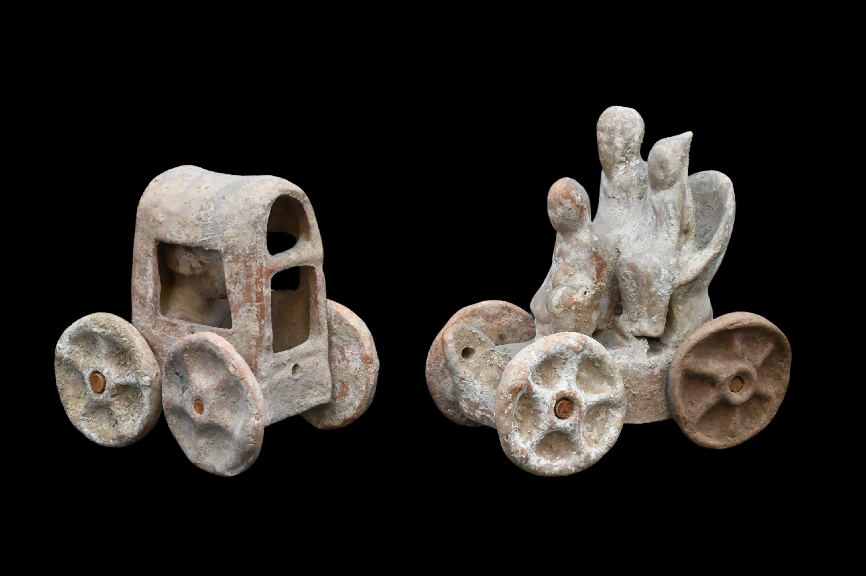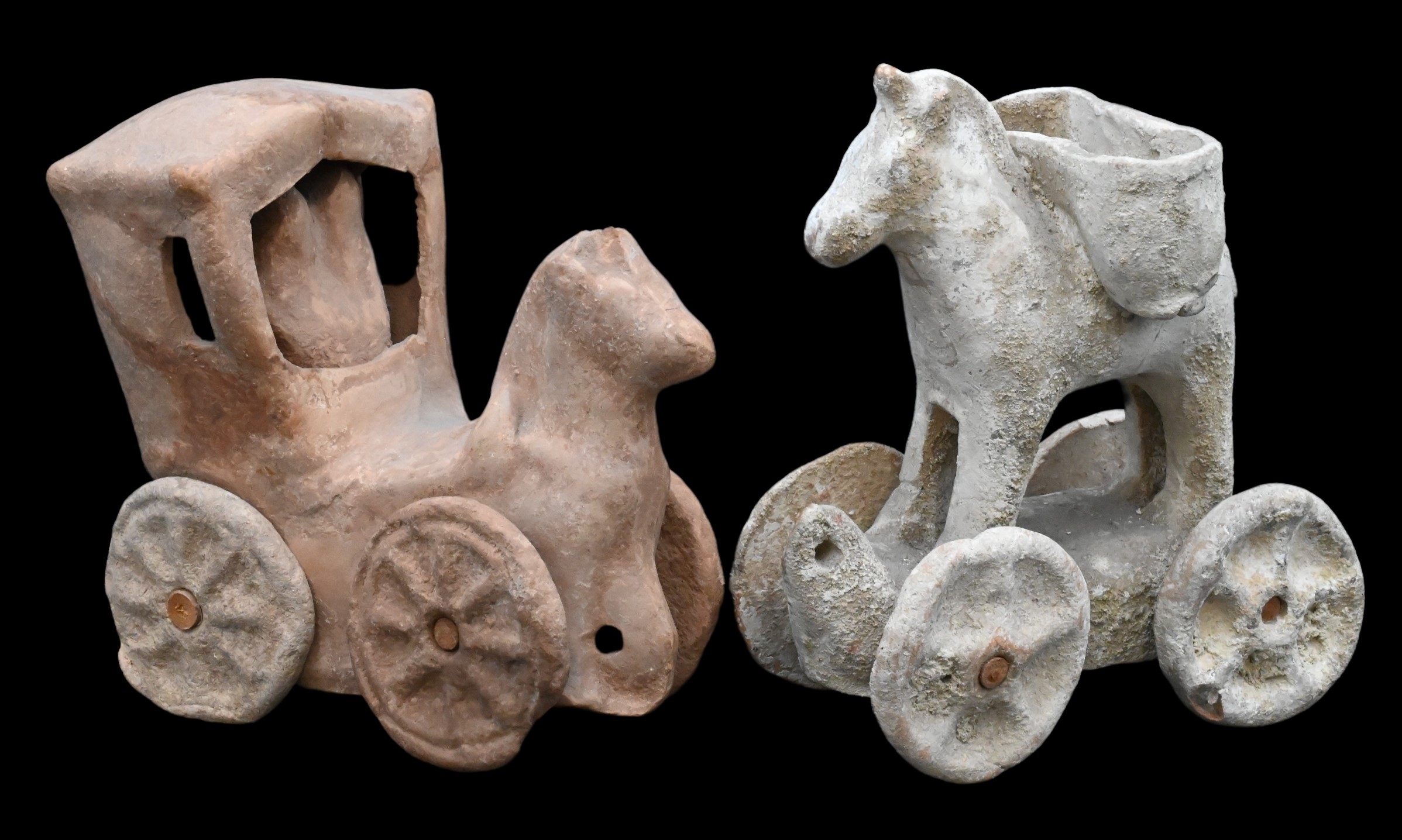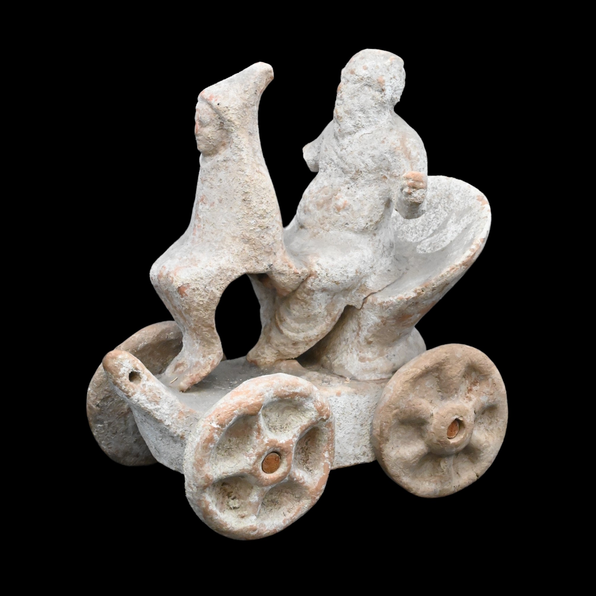 Two Greek Terracotta and Pottery Horses with Wheels and Cart Figures