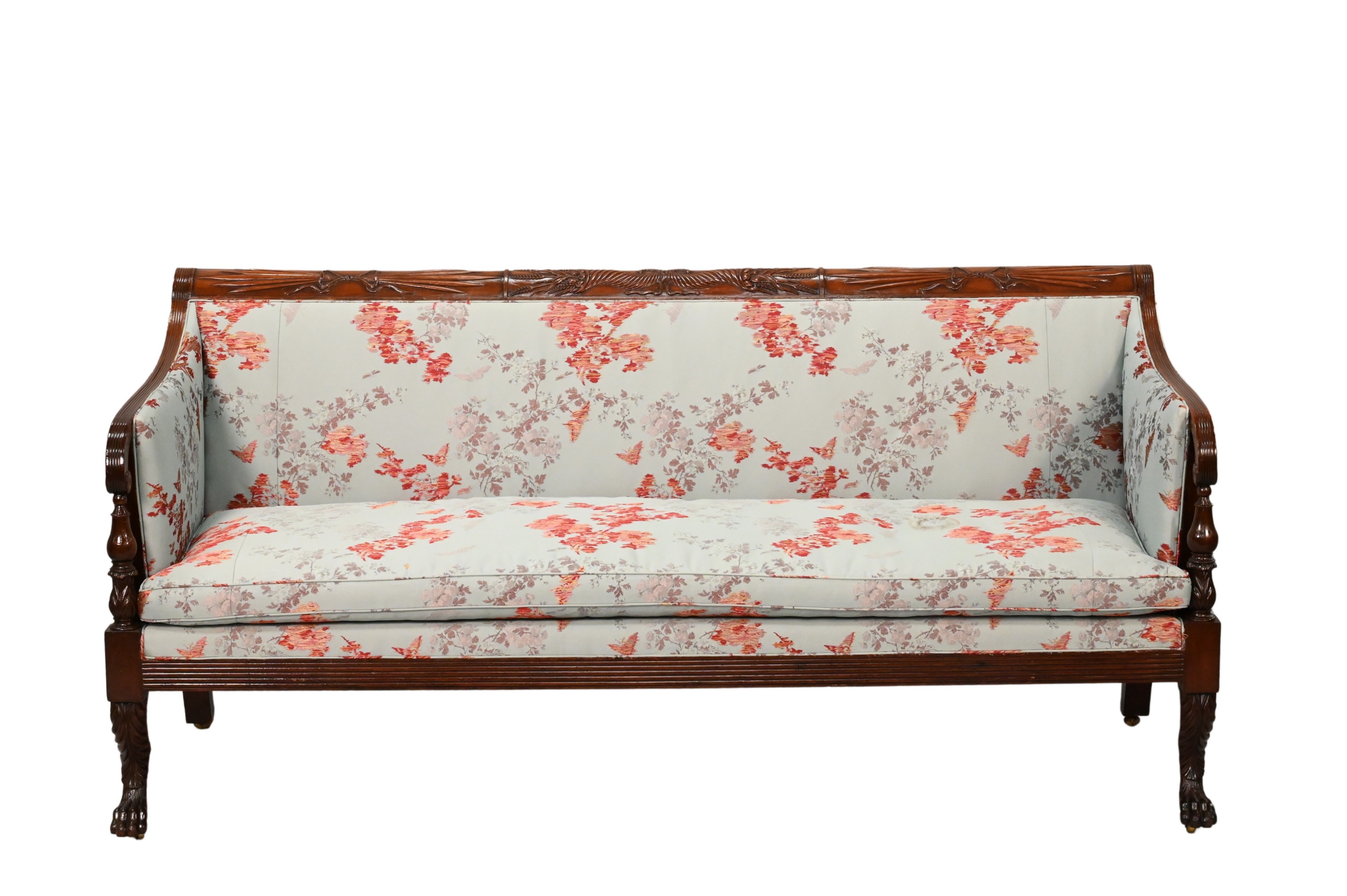 Reeded arms on turned and carved supports, set on carved paw feet