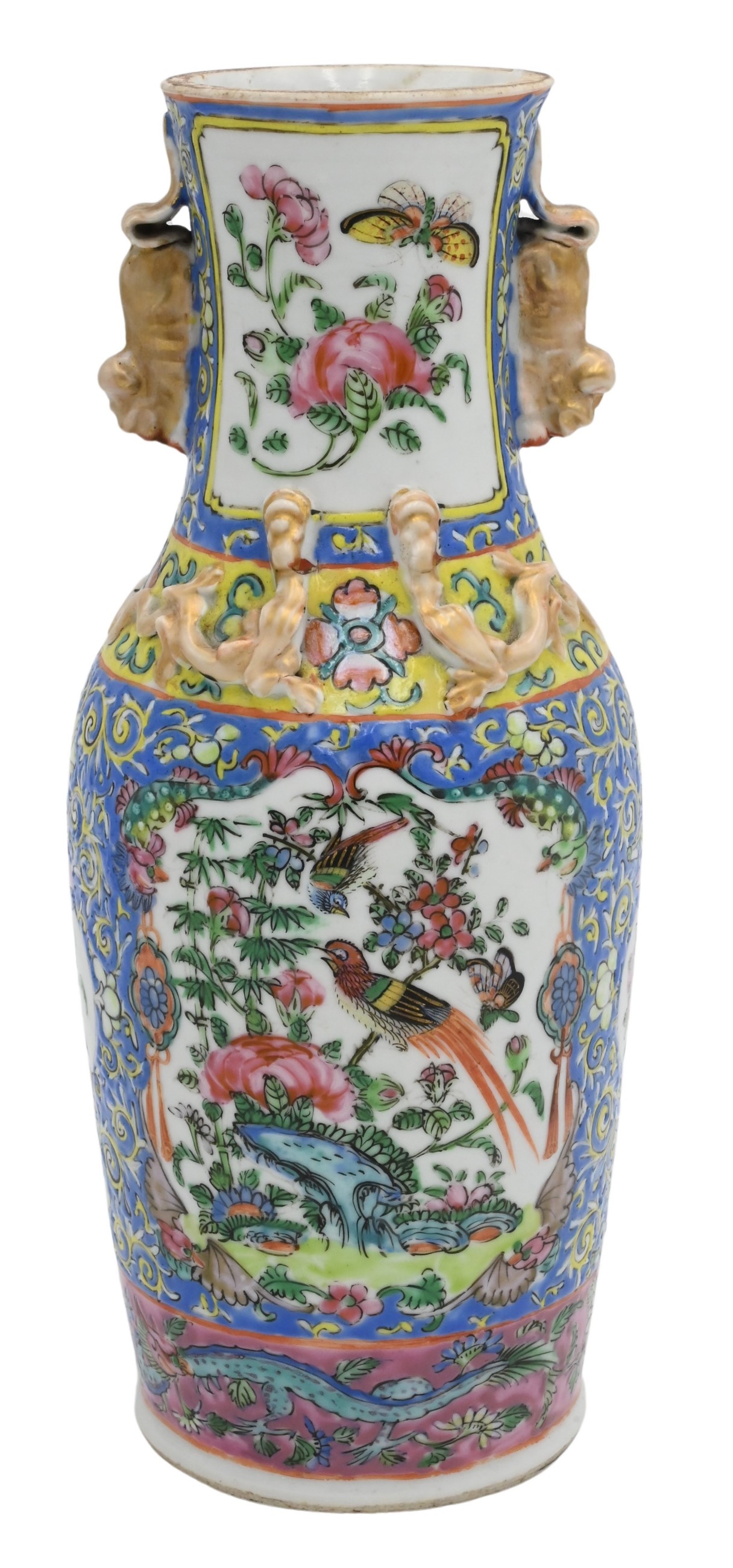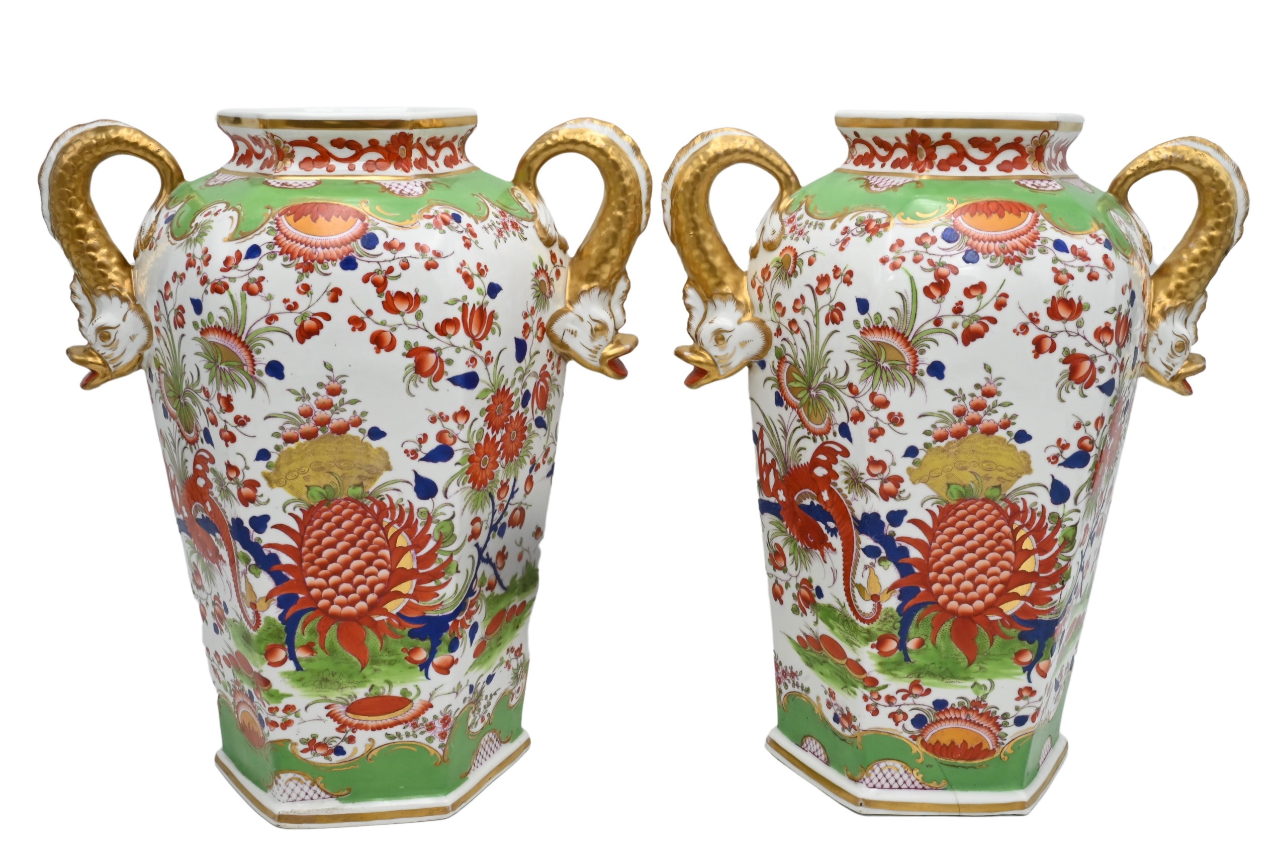 Pair of Worcester Chamberlain Hexagonal Vases, each having dolphin handles painted in the “Jabberwocky” pattern, height 14 inches