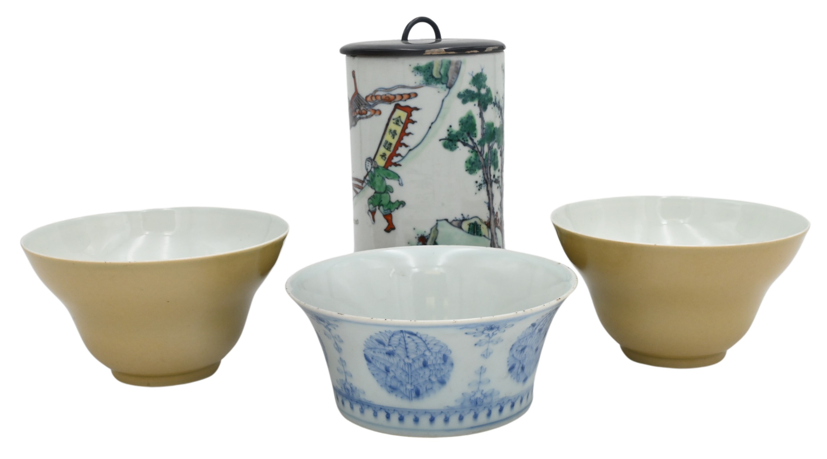 To include a pair of tan glazed porcelain bowls in a fitted box along with a blue and white bowl and a brush pot painted with figures having wood cover and base
