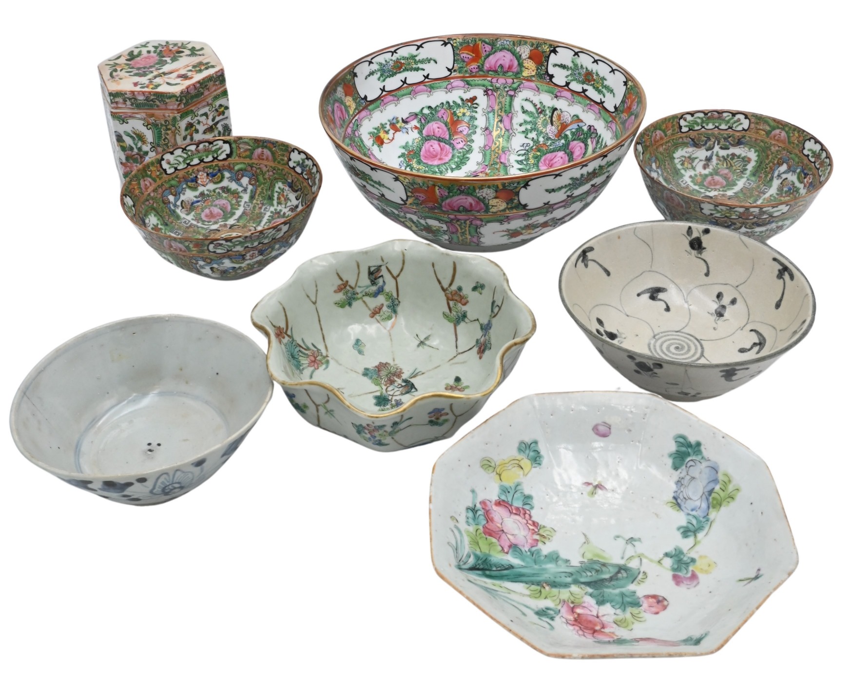 four rose medallion pieces along with two Canton bowls & two Chinese porcelain bowls