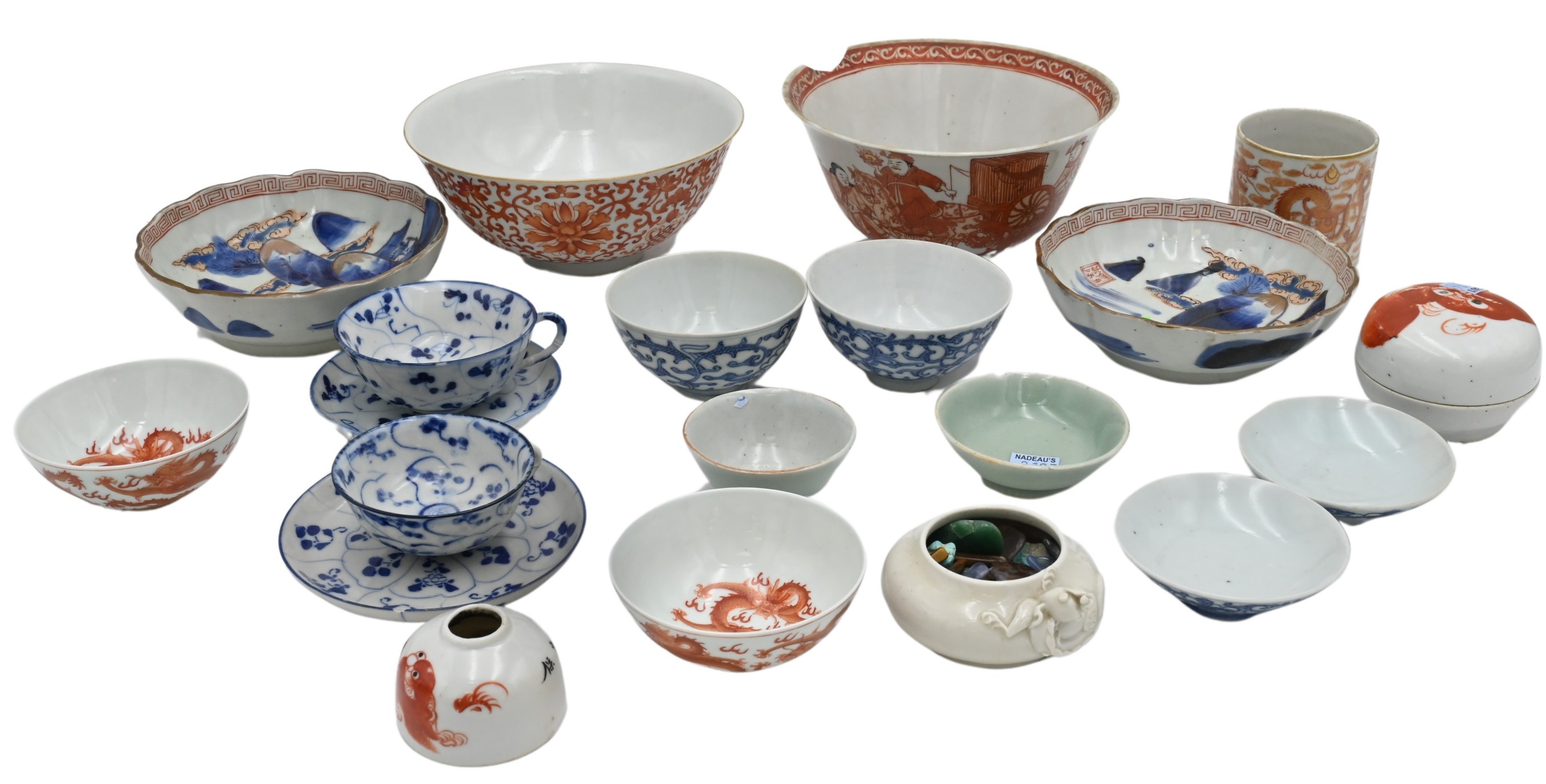To include Chinese porcelain bowl with red painted figures, ink pot, seal box with dog, blue and white cups etc.