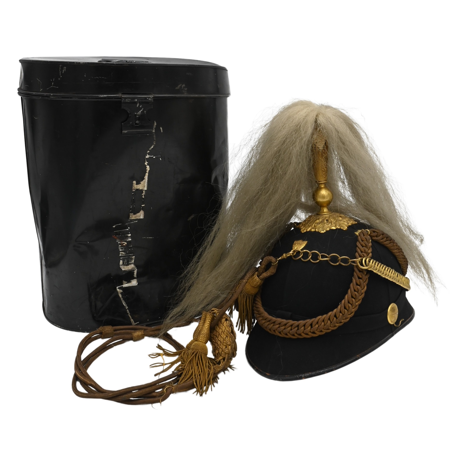 Plume and braided gold cords on helmet with original tin painted box