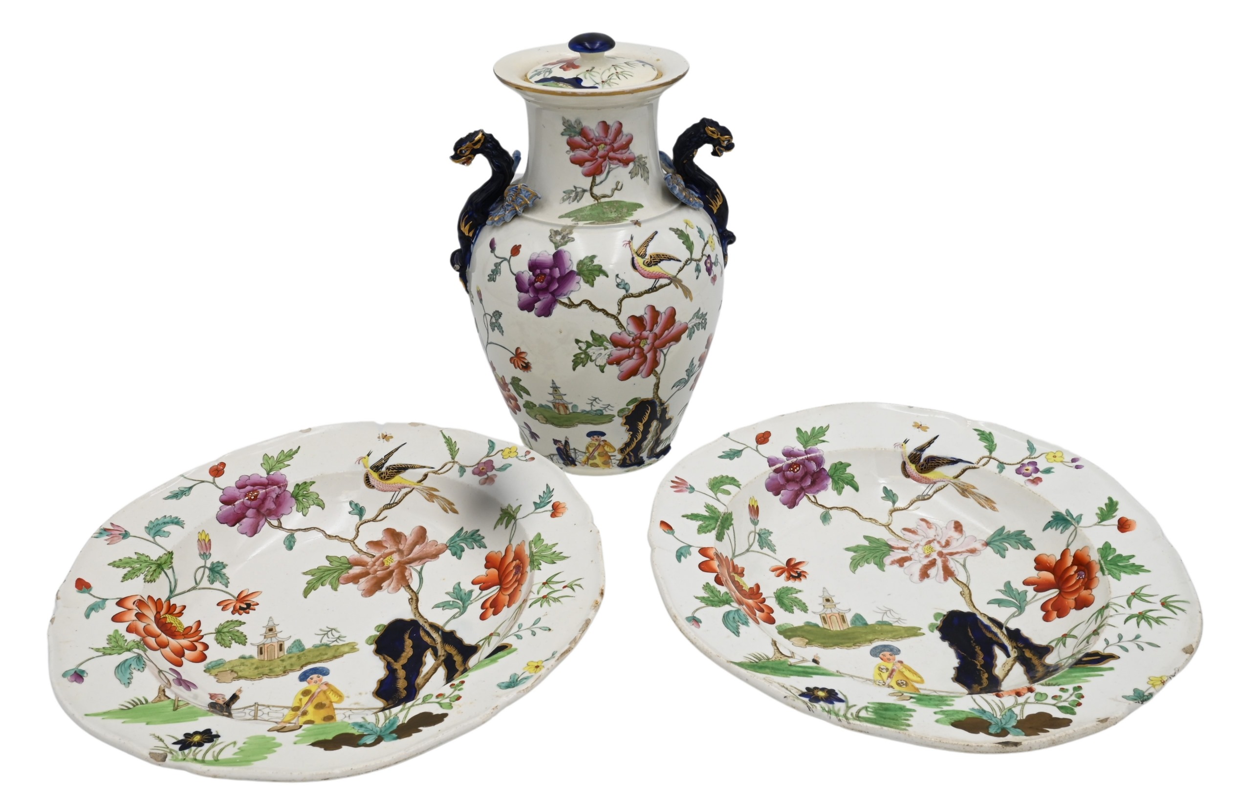 To include two deep dishes, and a covered vase having dragon handles and chinoiserie decor