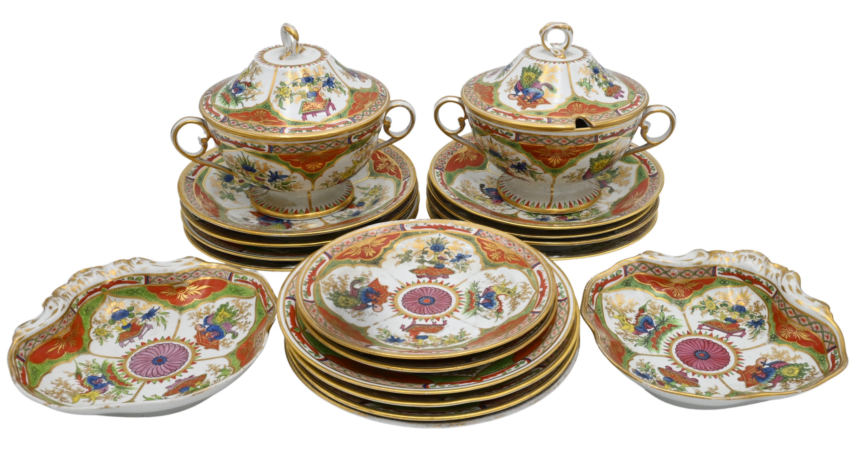 To include two covered tureens, set of twelve plates plus two additional plates, and two shaped dishes