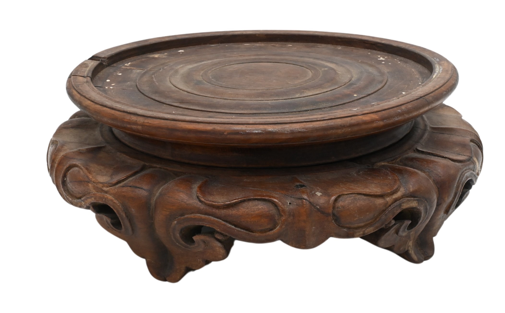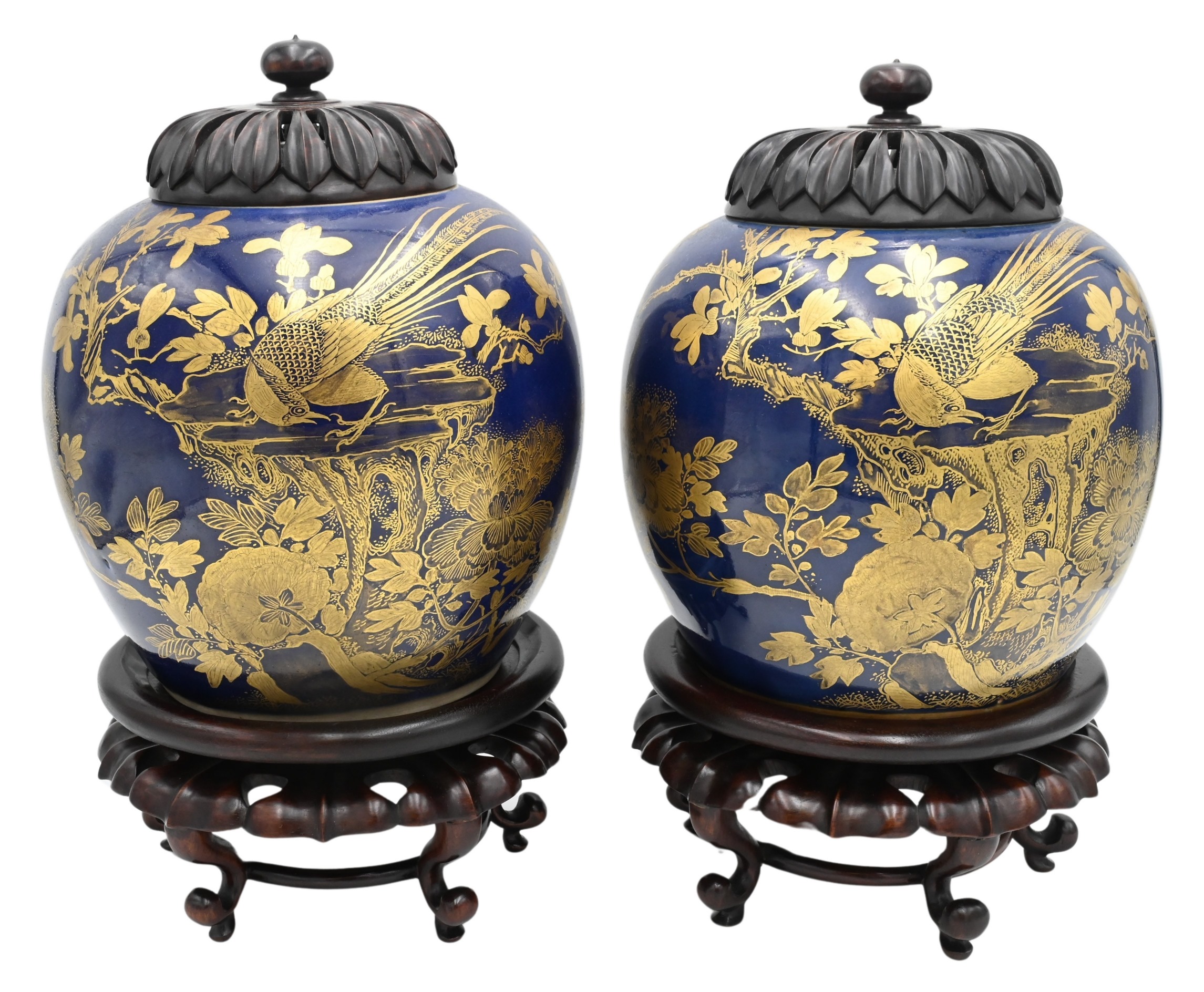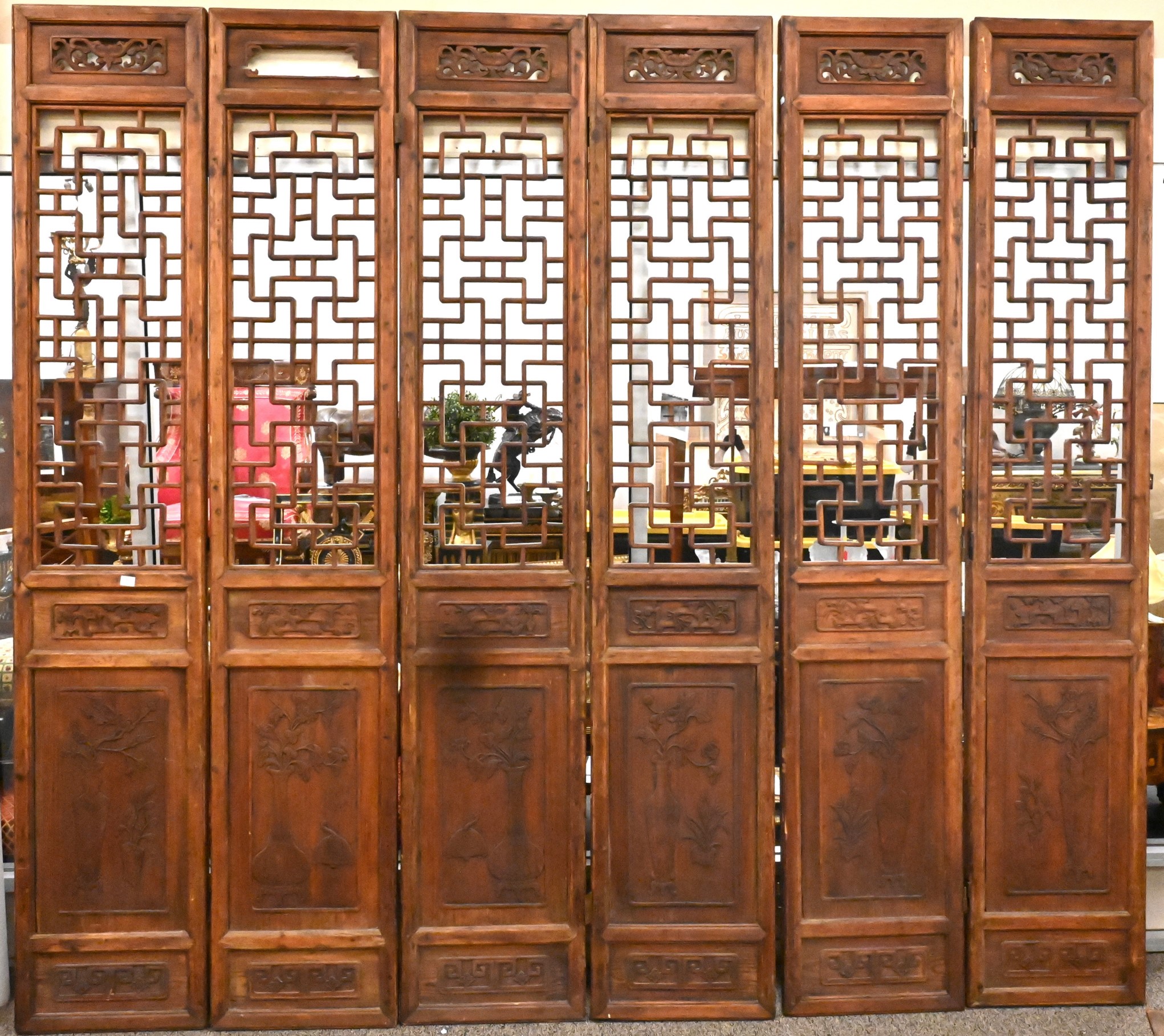 With open work tops, each carved with various vases of flowers
