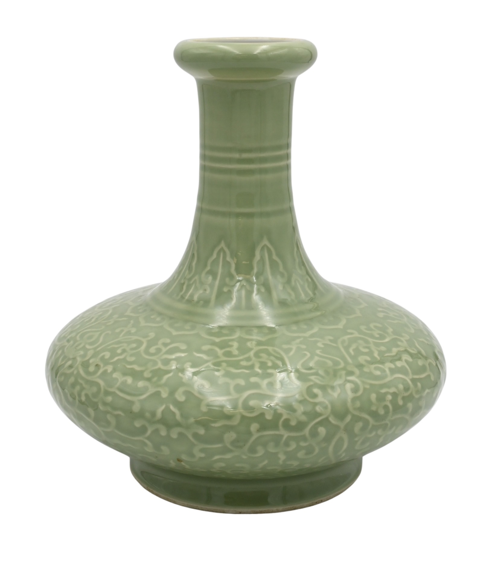 celadon double gourd vase having incised scrolling wines, light blue double gourd vase