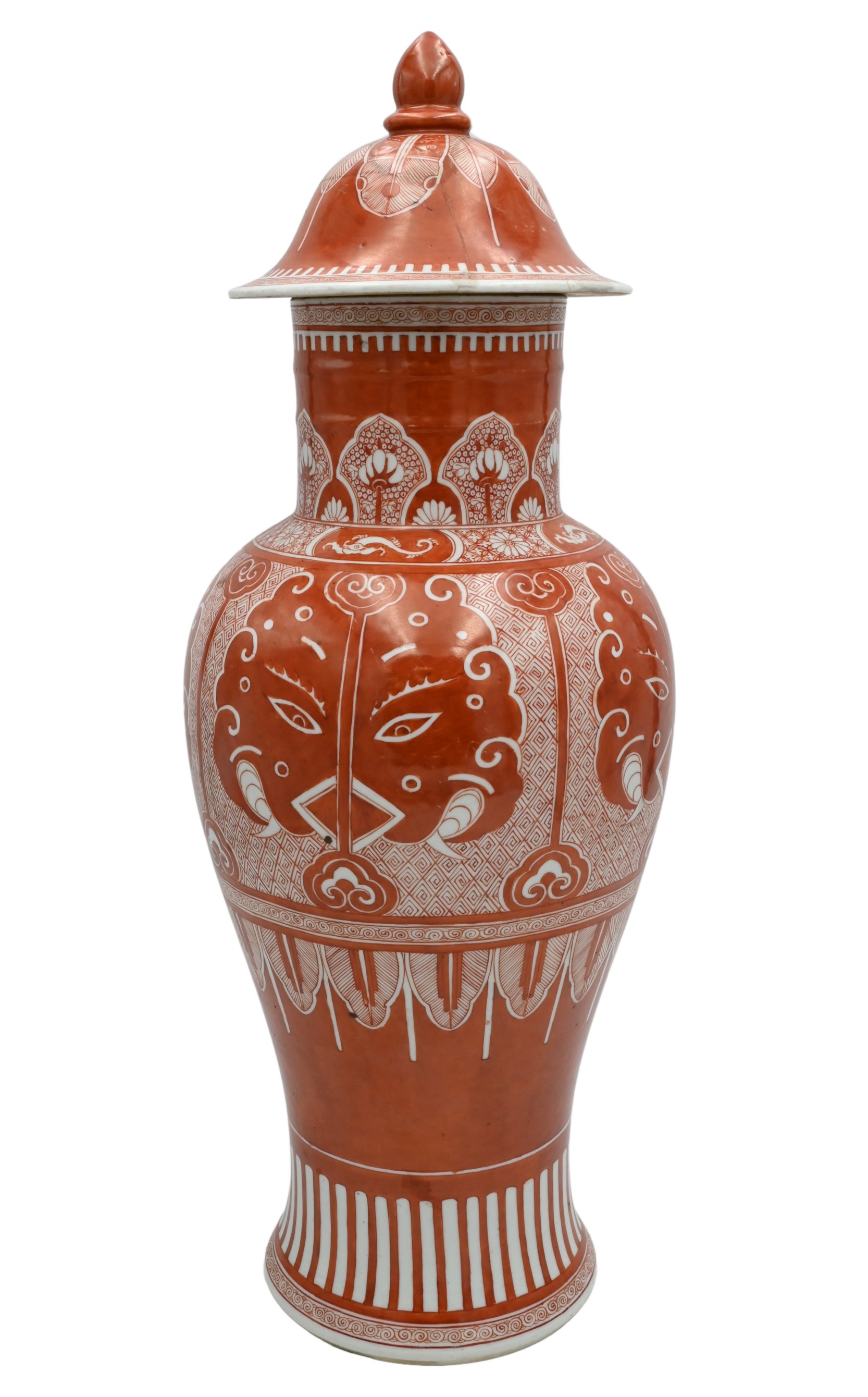 Chinese Porcelain Iron Red “Taotie” Baluster Vase and Cover