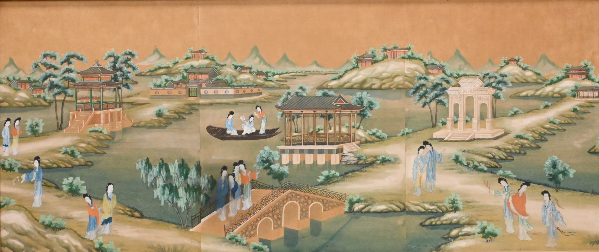 Each painted with figures and scholars in landscape