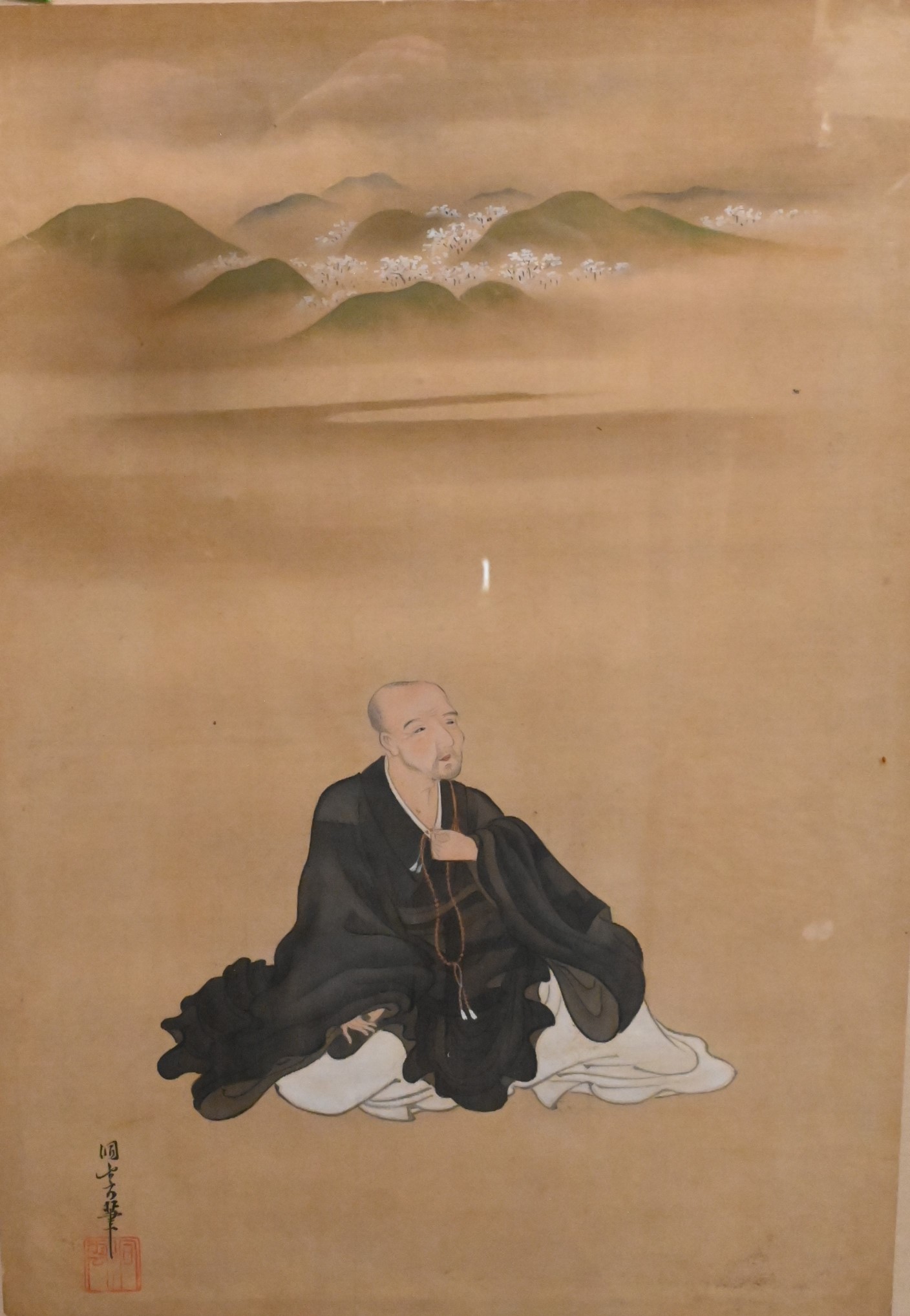 Chinese silk portrait of a scholar with mountainous landscape background