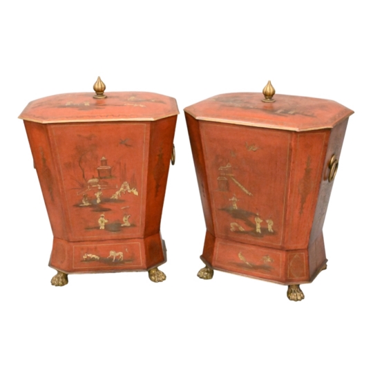 Pair of Regency Chinoiserie Decorated Tole Coal Bins