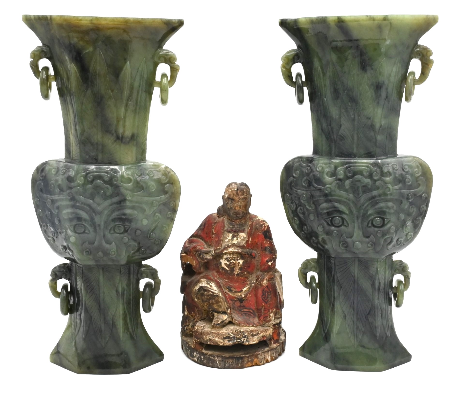 pair of jade vessels with ring handles. Ralph Chait Galleries label on bottoms