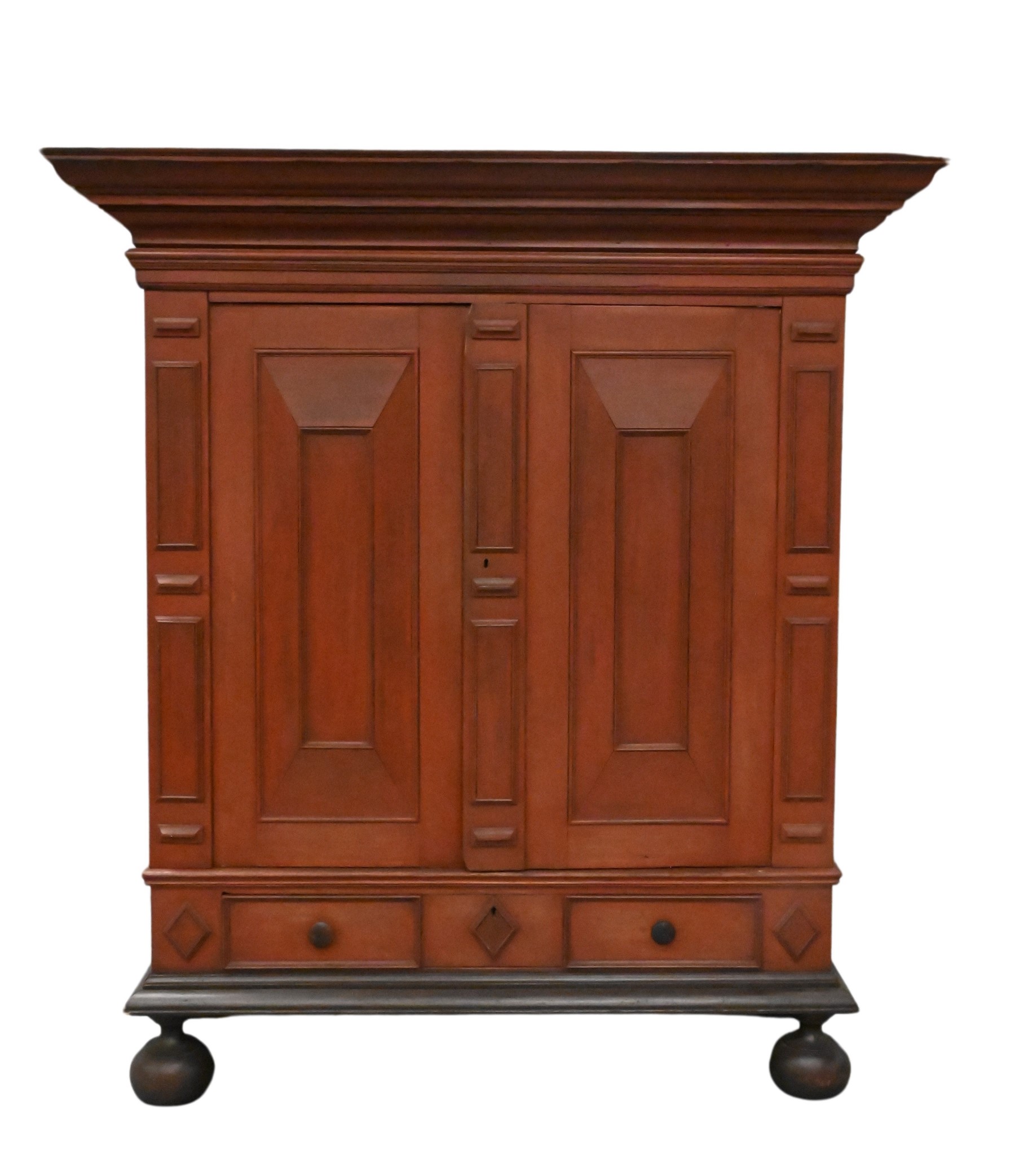 Having large cornice moulding, over two doors with raised panels over drawer set on bun feet in red stain