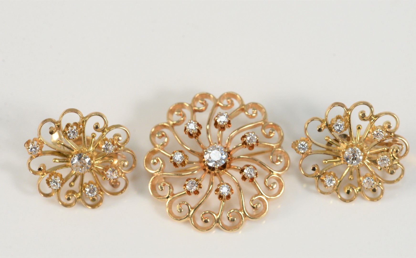 Three Piece 14 Karat Gold and Diamond Brooch and Earring Set