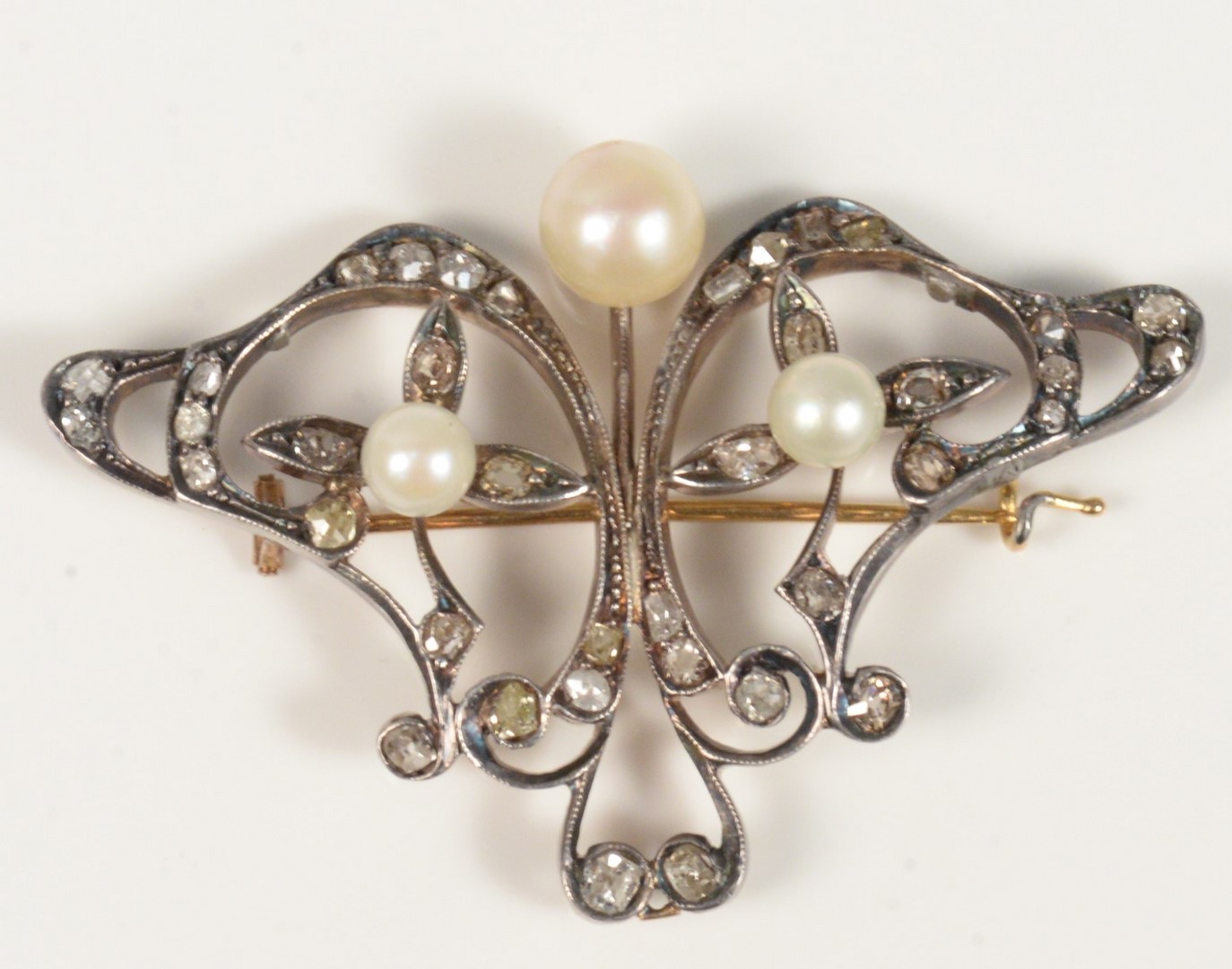 having twenty-five pearls atop gold, set with three rose cut diamonds, each separated by rose cut diamonds, along with matching gold, diamond, and pearl earrings