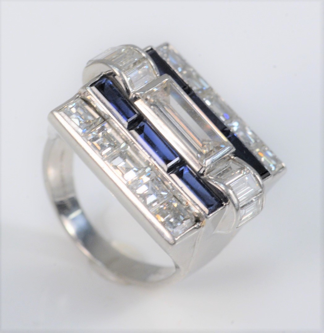 Van Cleef Arpels Platinum Diamond and Blue Sapphire Ring set with center emerald cut diamond, flanked by three emerald cut diamonds on either side, center flanked by three emerald cut blue sapphires, flanked by five square cut diamonds on either side marked Van Cleef Arpels, marked V1975 size 6 1/2 17.6 grams