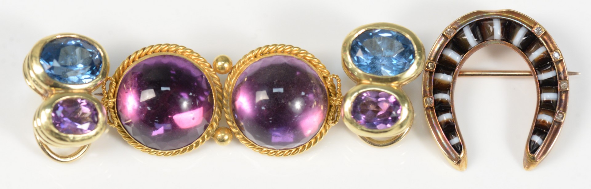to include pair of ear clips, each set with large blue topaz, and amethyst a horseshoe pin with small diamond chips, along with a Victorian pin with two cabochon cut amethyst