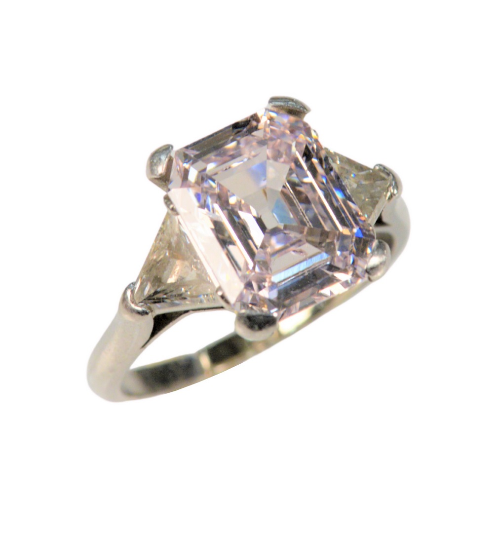 Platinum and Diamond Ring set with SI1 4.54 carat emerald cut diamond, flanked by trillion cut diamonds, Natural/Very Light Pink color, measuring 11.80 x 9.31 x 4.78 millimeters, G.I.A. report # 2211316330.