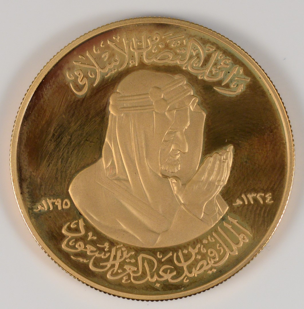 1975 22 Karat Gold Medal that was issued to memorialize the death assassination of King Faisal of Saudi Arabia on March 25, 1975 Originally issued in Proof quality with a special presentation box. 49.5 grams