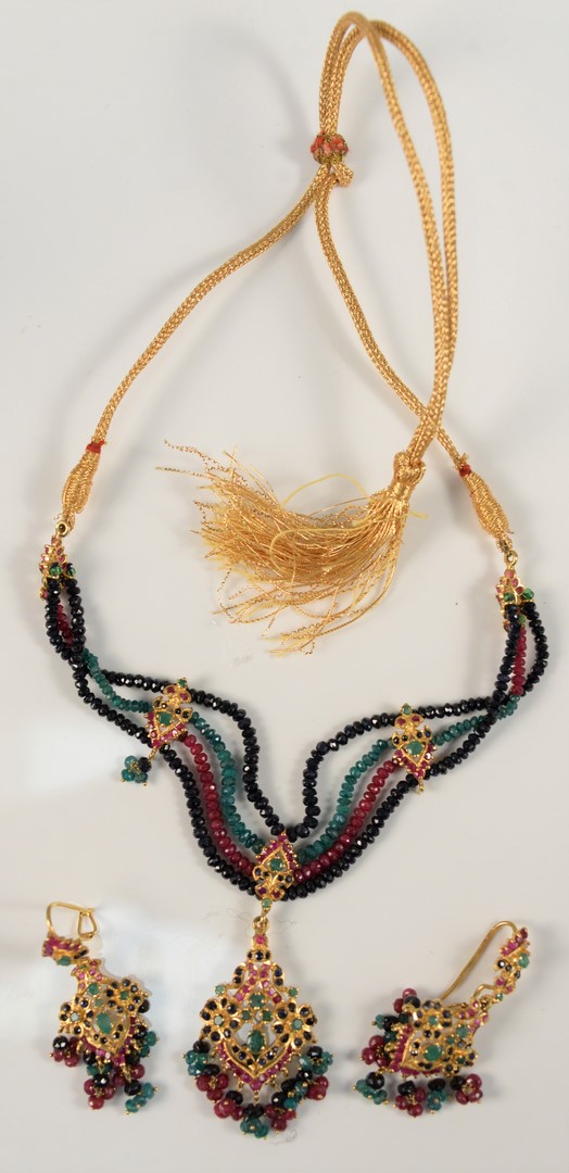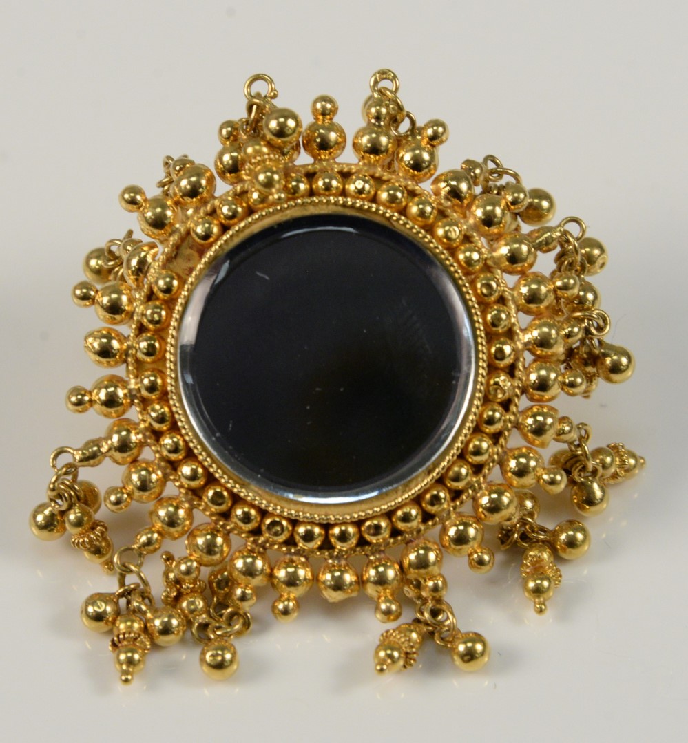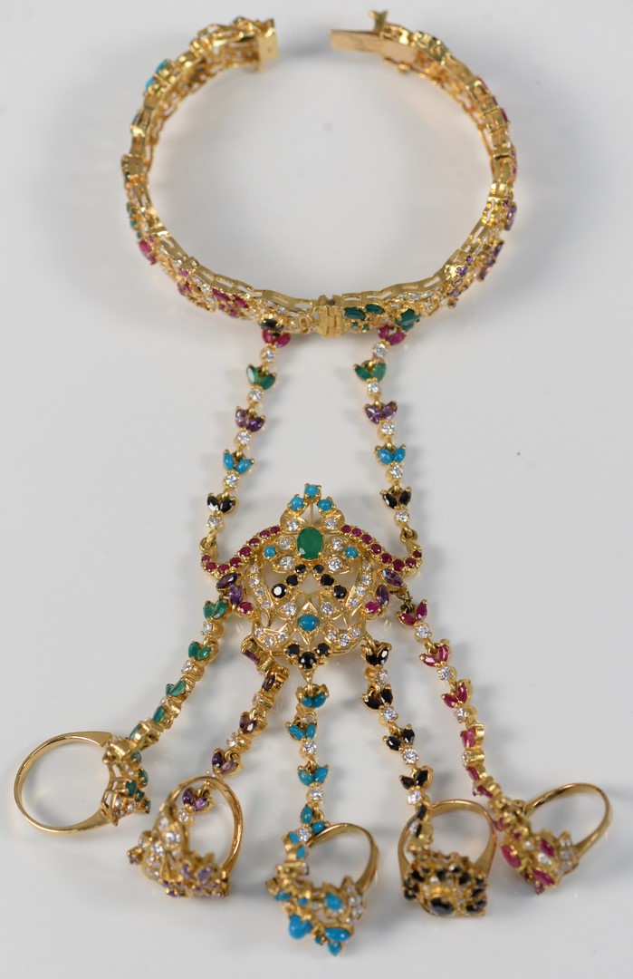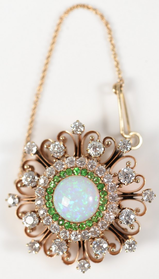 with center fire opal, encircled by green garnets, surrounded by rows of diamonds