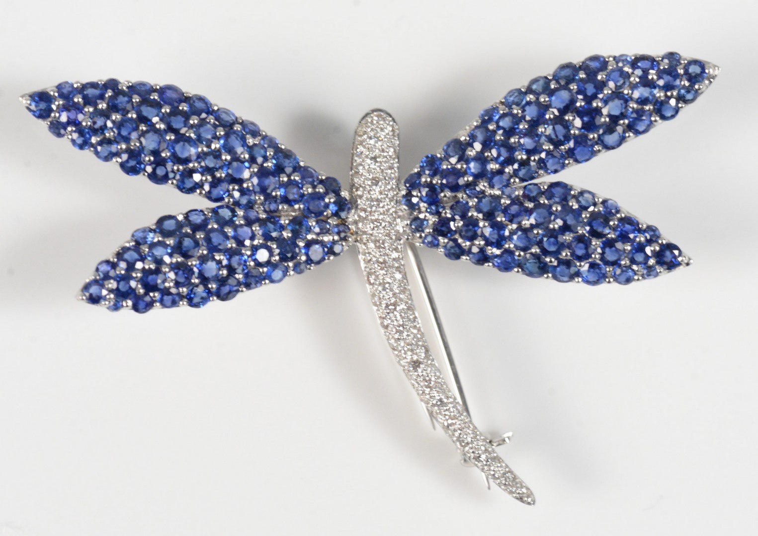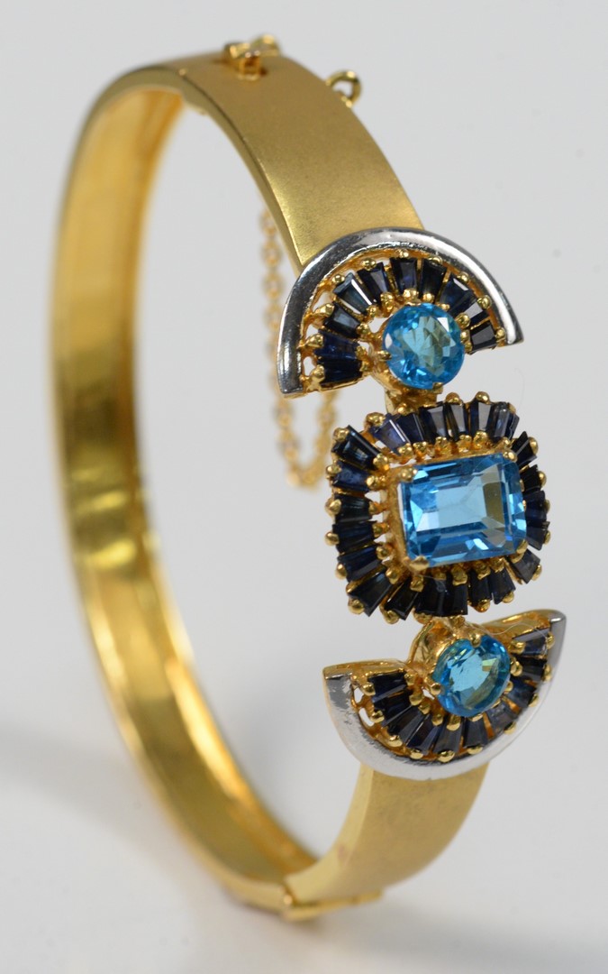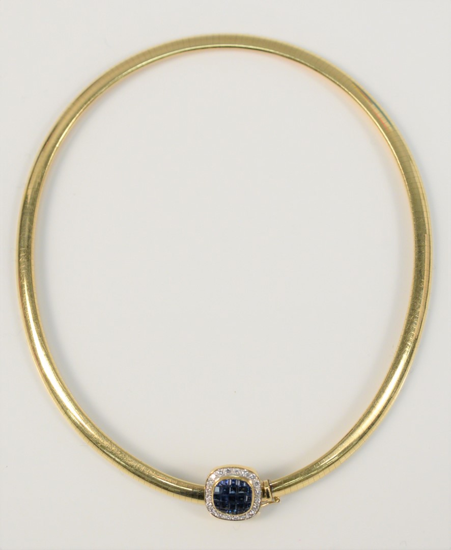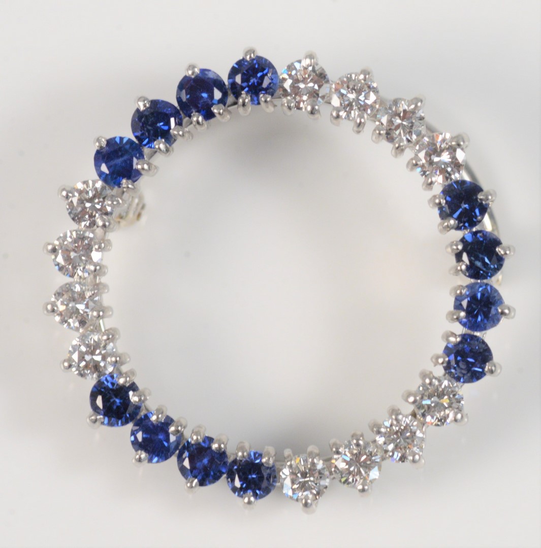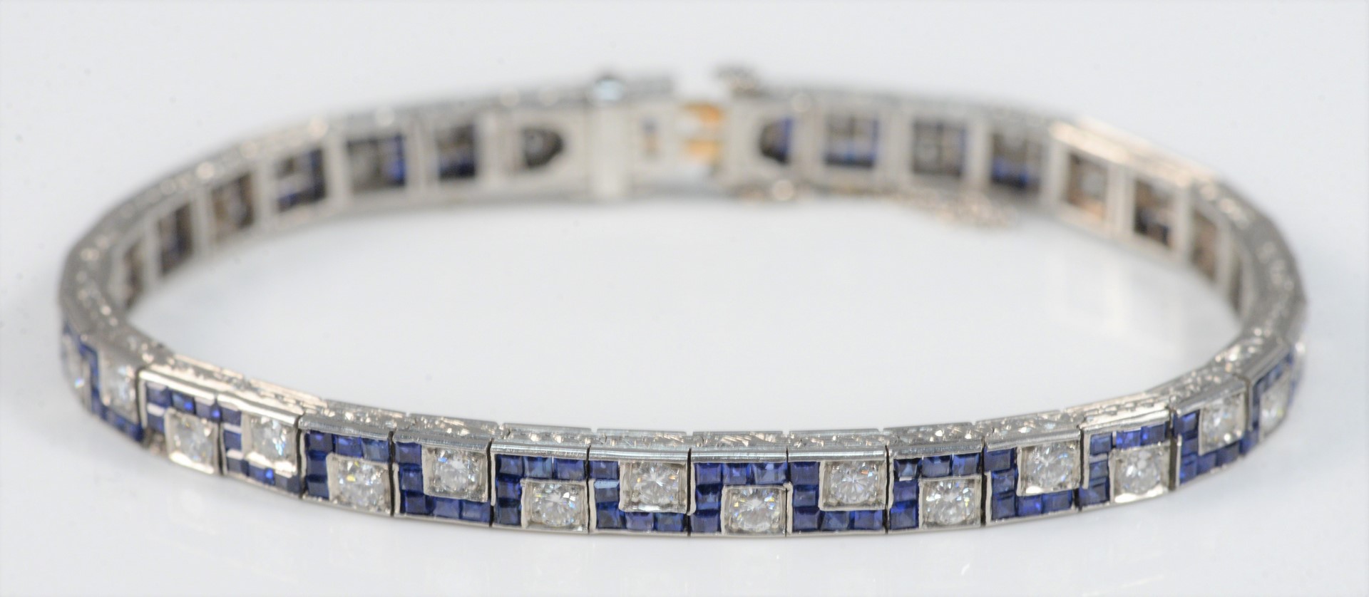 set with thirty-four diamonds, surrounded by Greek key design, with square blue sapphires, one small sapphire missing,