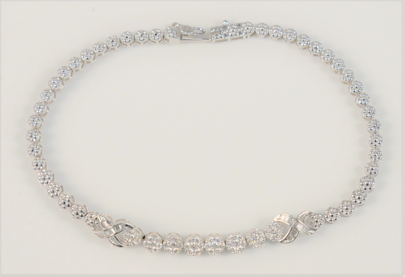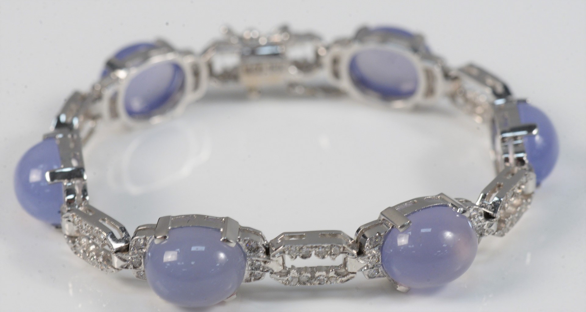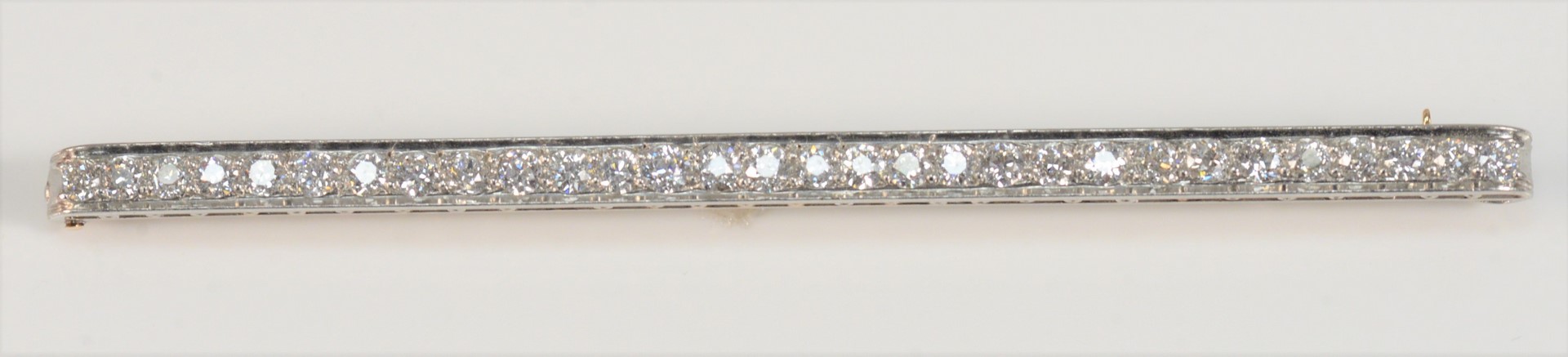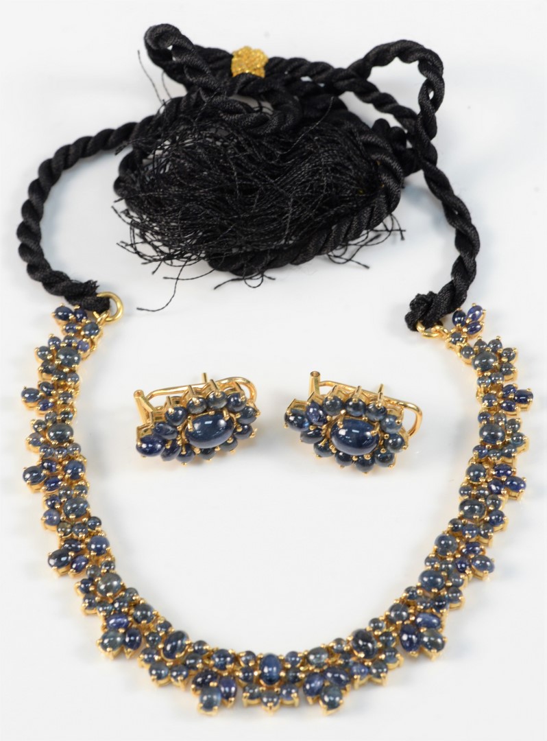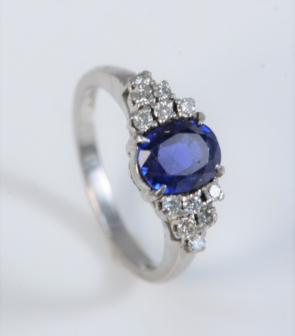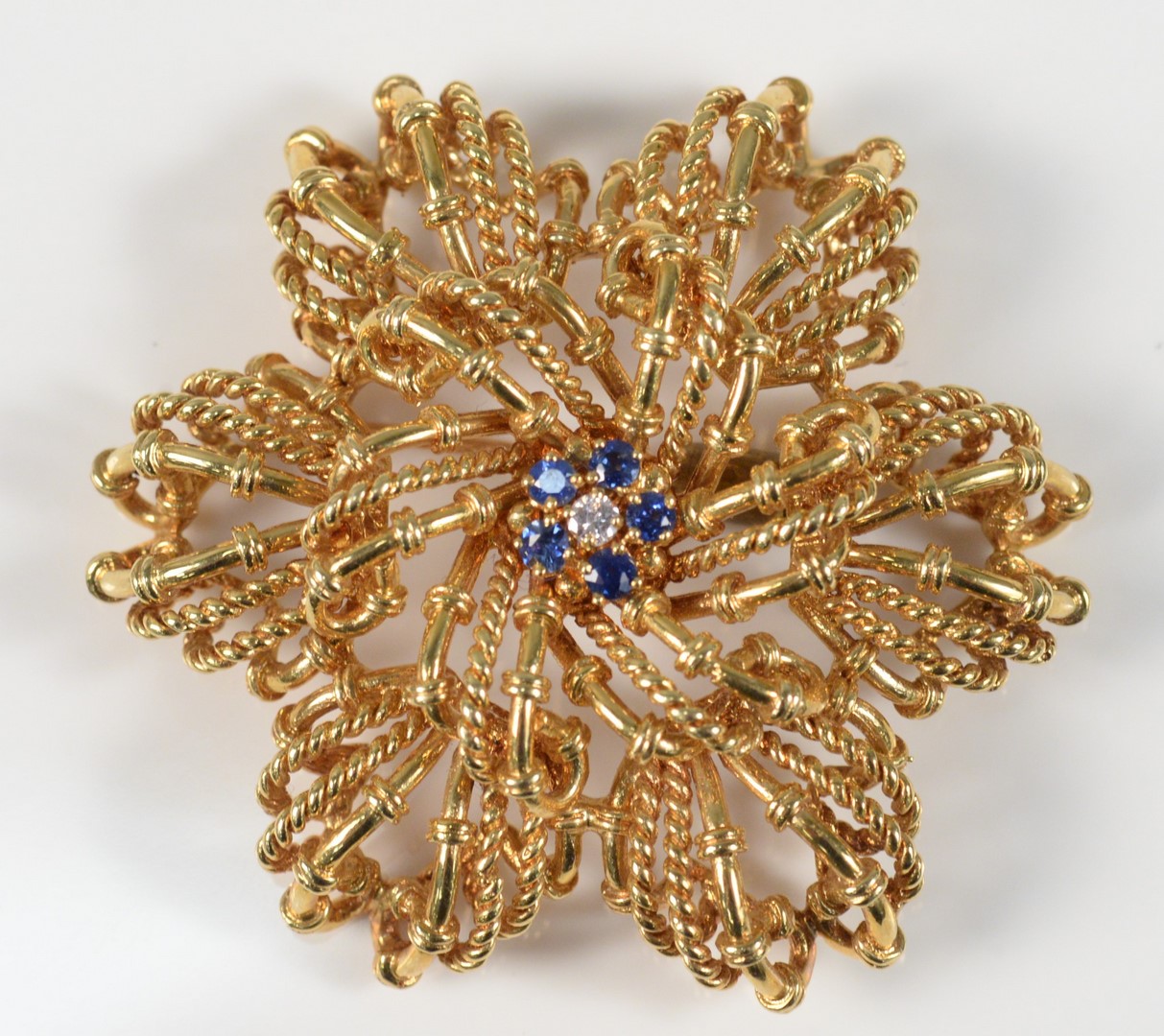 set with thirty-four diamonds, surrounded by Greek key design, with square blue sapphires, one small sapphire missing,