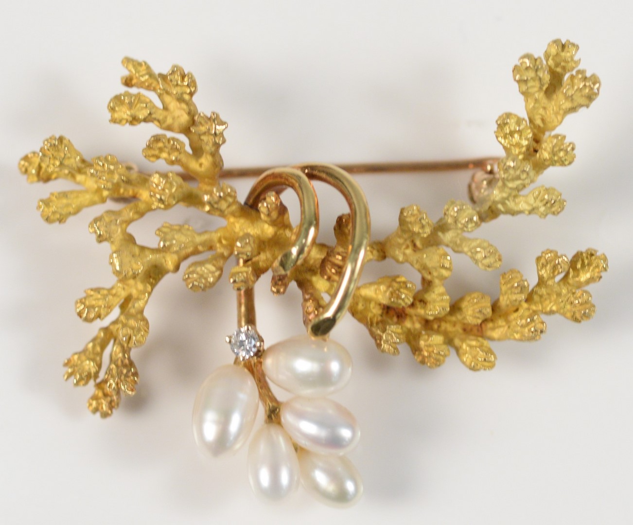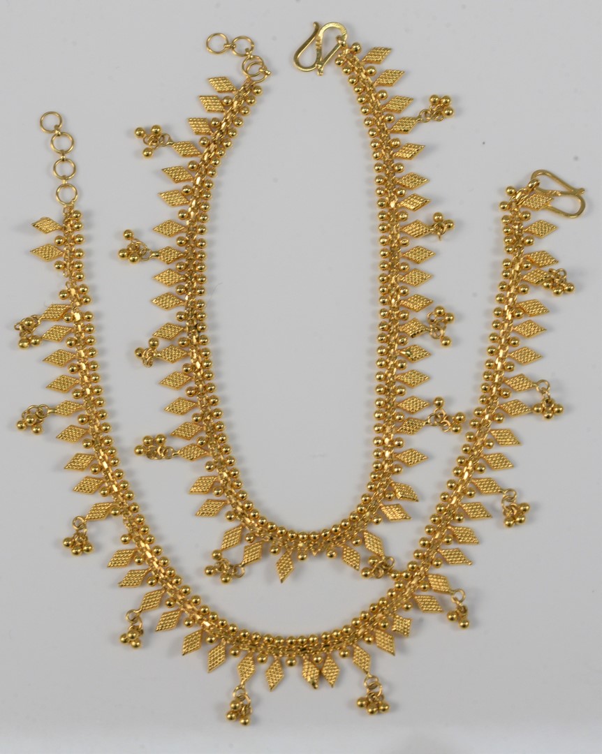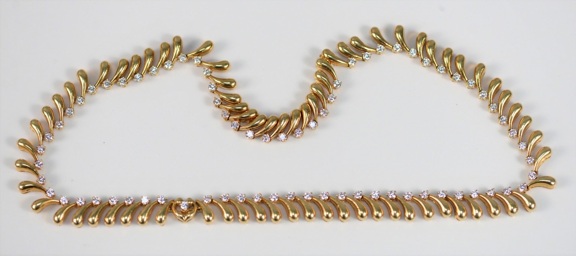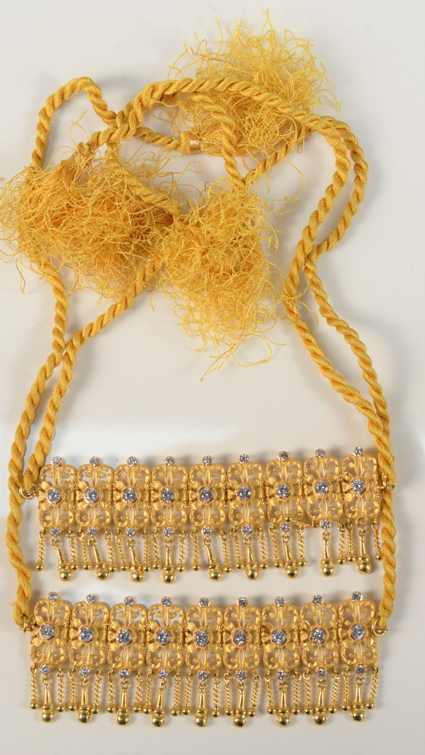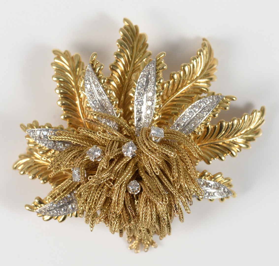 six fern leaves set with diamonds and gold tassels, approximately one hundred fourteen diamonds