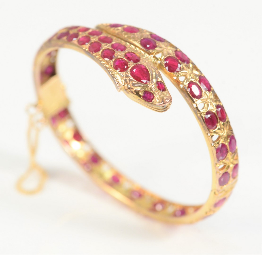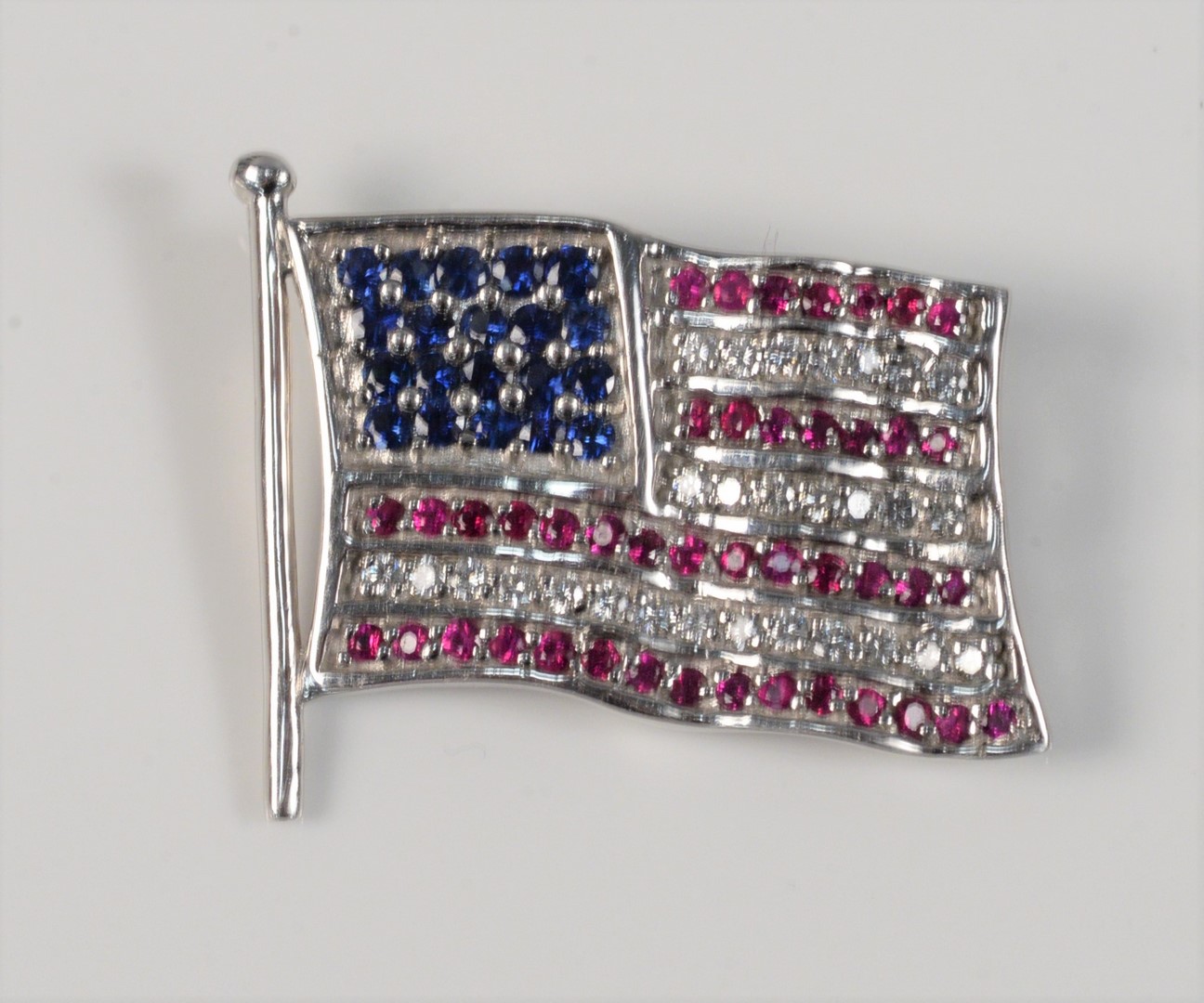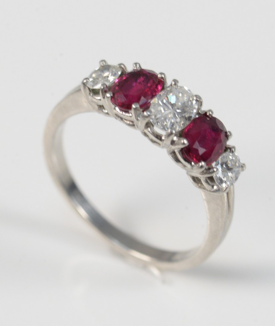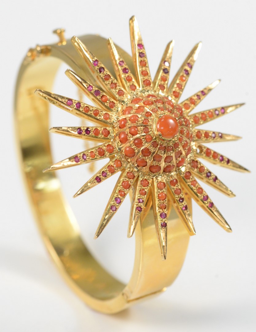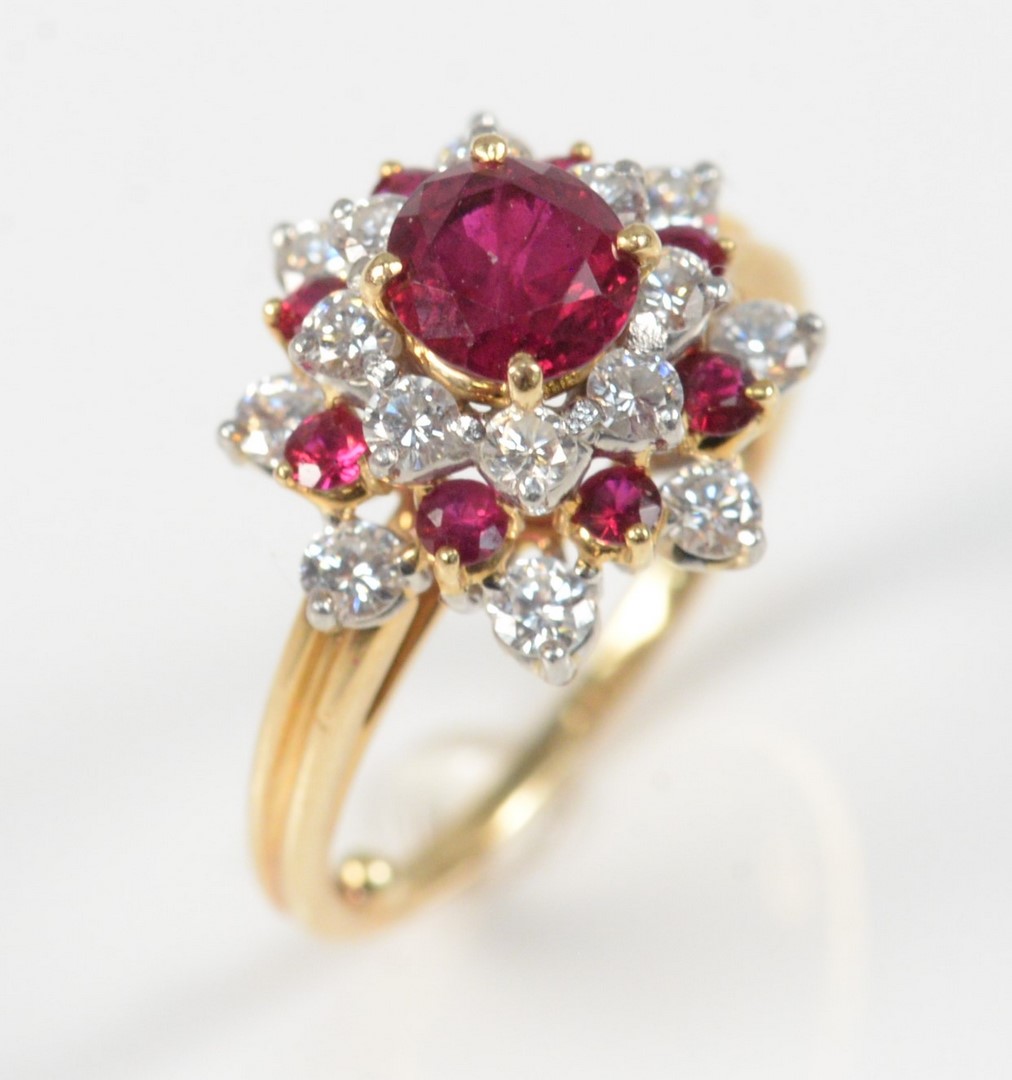 set with center ruby, encircled by eight diamonds, then by eight rubies, and ending in eight diamonds