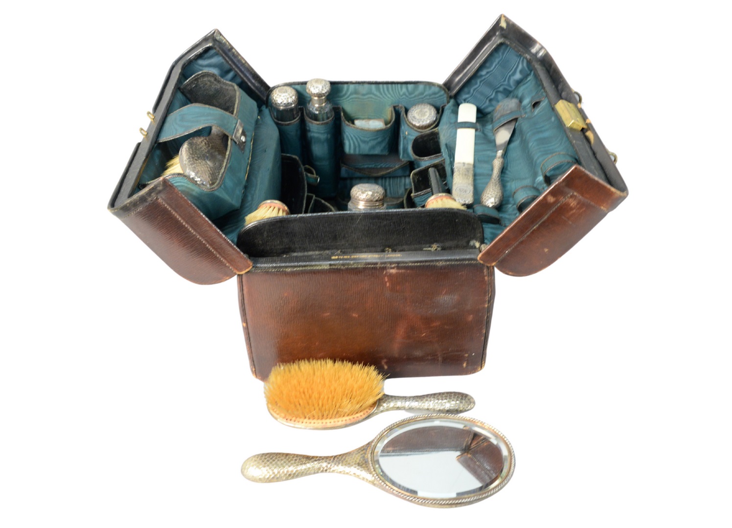 having fitted interior, with hand hammered silver, vanity items including brush, shoe horn, bottles, mirror, etc.