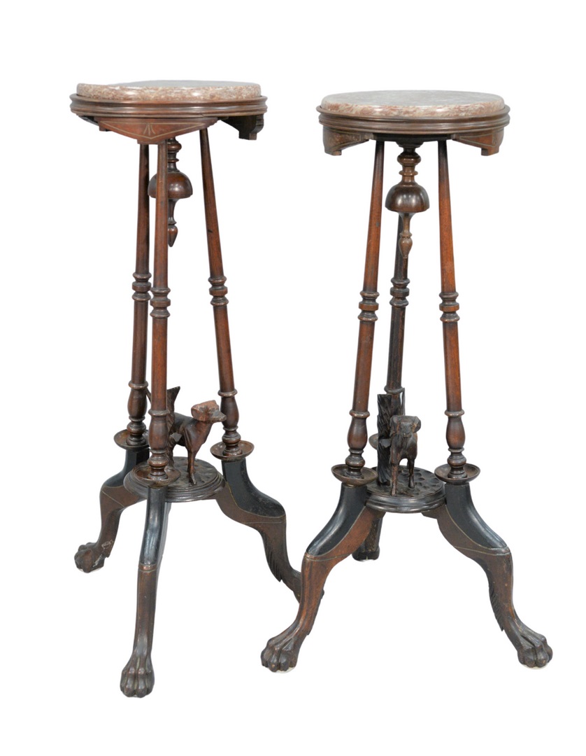 each with brown round marble tops, on turned supports, with carved dog above tripod base, ending in claw feet