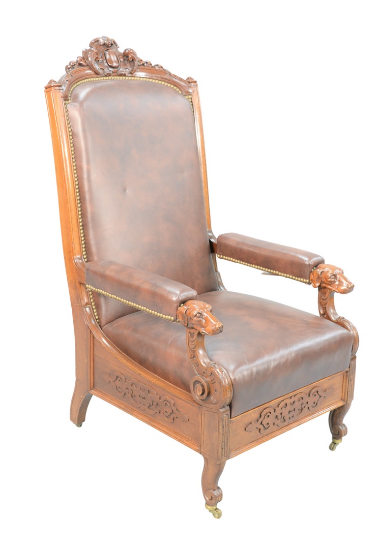 with brown leather upholstery, and carved dog head hand supports, with pullout foot support