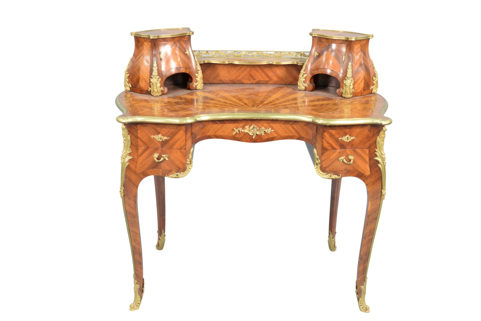 Louis XV Style Writing Desk having double cabinet top, over parquetry inlaid top surface, with brass mounts over center drawer, flanked by two drawers, set on cabriole legs lock signed P. Schneider, Paris height 38 1/2 inches, top 23 x 39 1/2 Provenance: The Estate of Alina Roisen, Park Avenue, New York