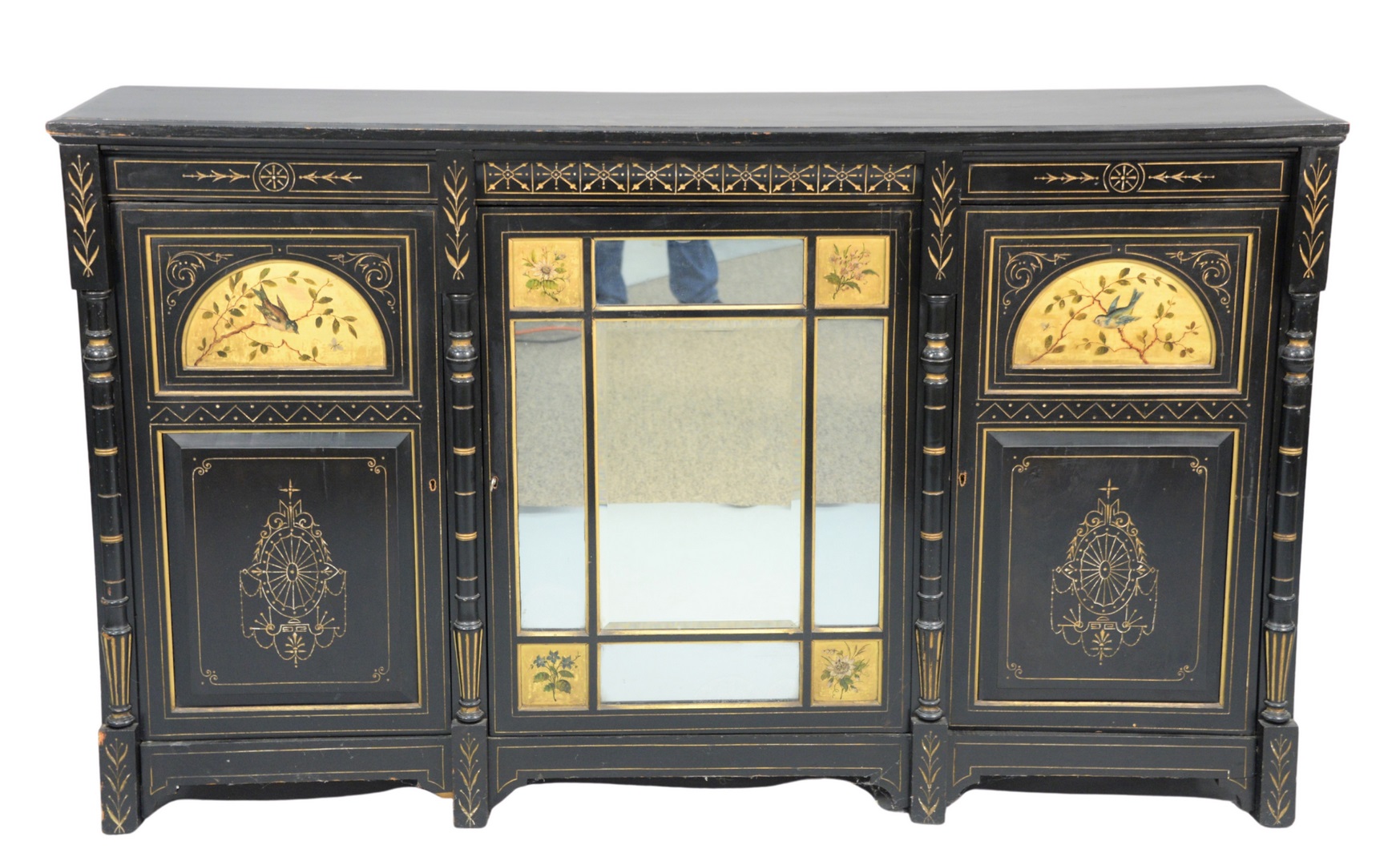 with mirrored center door having four painted panels, flanked by doors, each with bird and branch painted panels