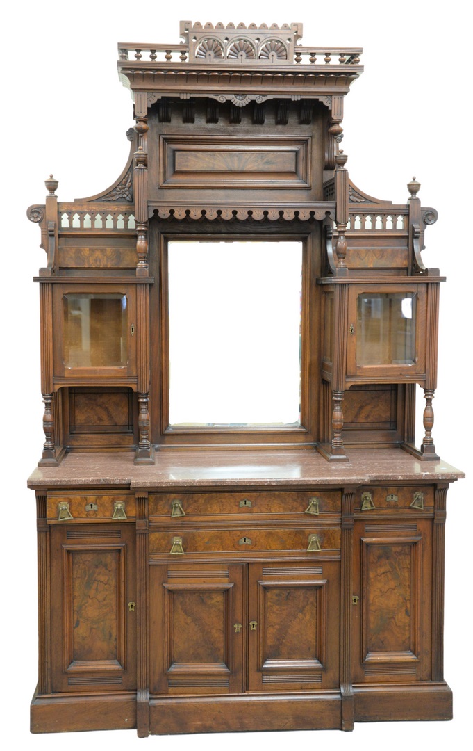 in two parts, upper section with hooded top over mirror, flanked by curio cabinets on lower section, with brown marble top, on cabinet base