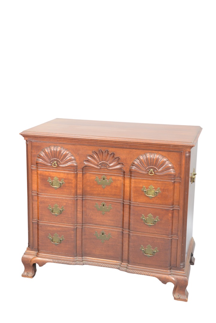 having triple fluted columns, set on shell carved block front, flanked by carved ogee feet, having brass handles on sides