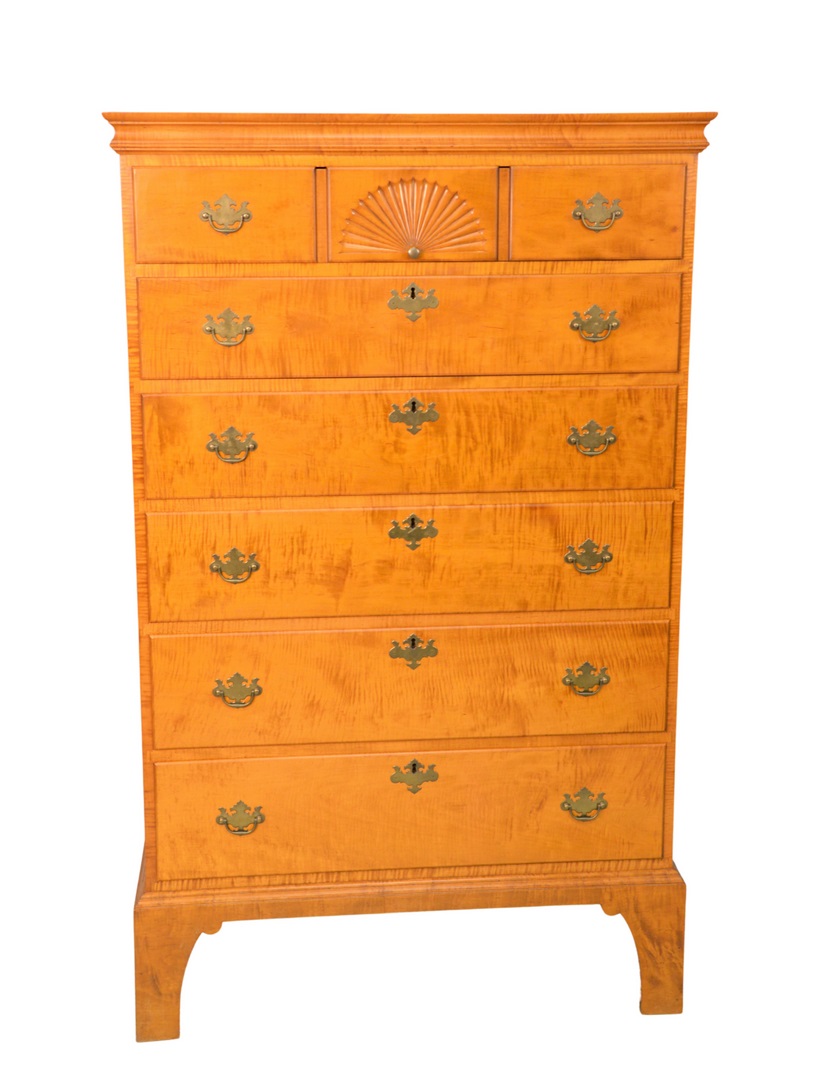 Jeffery Green Tiger Maple Six Drawer Tall Chest on bracket base height 61 1/2 inches, width 36 inches Provenance: From a Glastonbury, Connecticut Collection