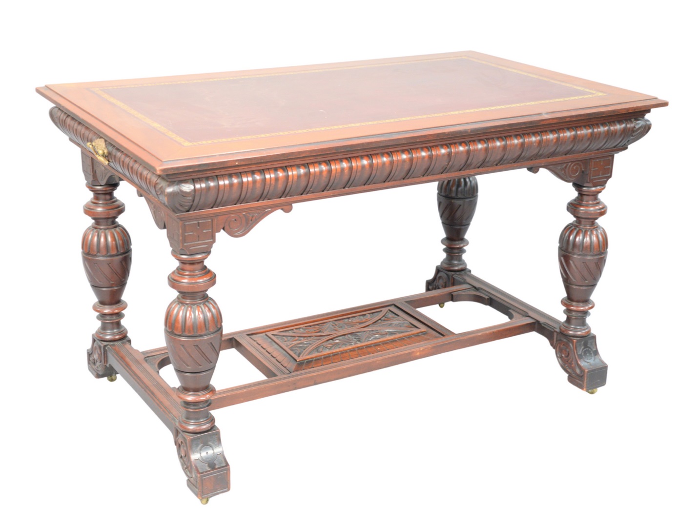 having tooled leather top, carved drawer on either end, set on carved legs, with panel carved stretcher, and scroll carved feet