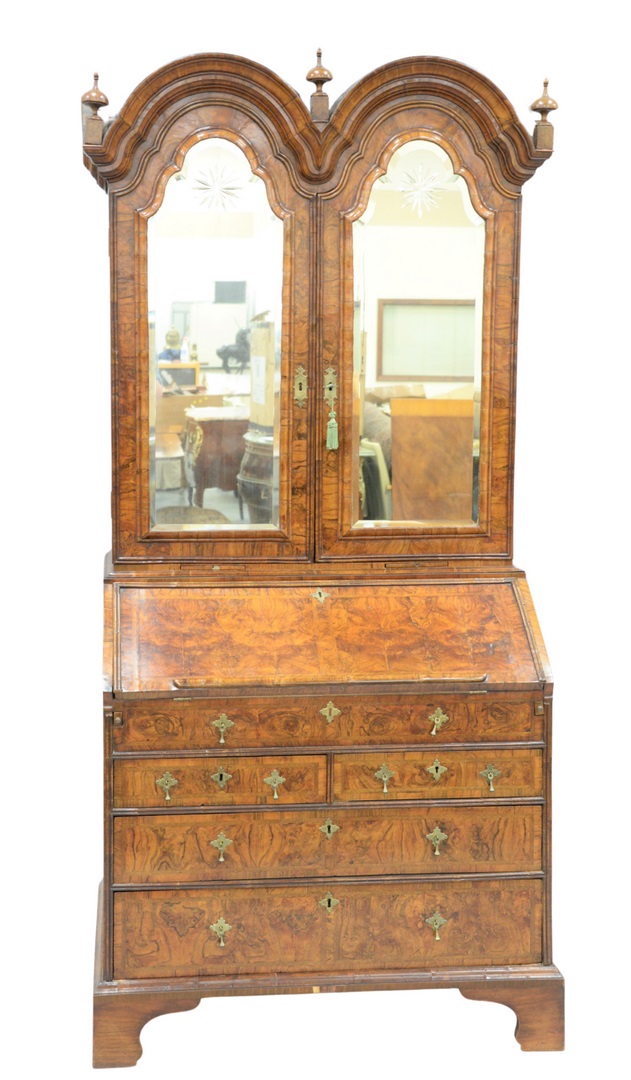 George I Figured Walnut Double-Domed Bureau Bookcase in two parts, the upper section with etched mirrored plates opening to shelves, the lower section with a fall-front, and fitted interior, above two short and two long drawers, raised on later bracket feet height 86 inches, width 40 3/4 inches Provenance: Hyde Park Antiques, New York: The Estate of Gloria Schiff, 630 Park Avenue, New York