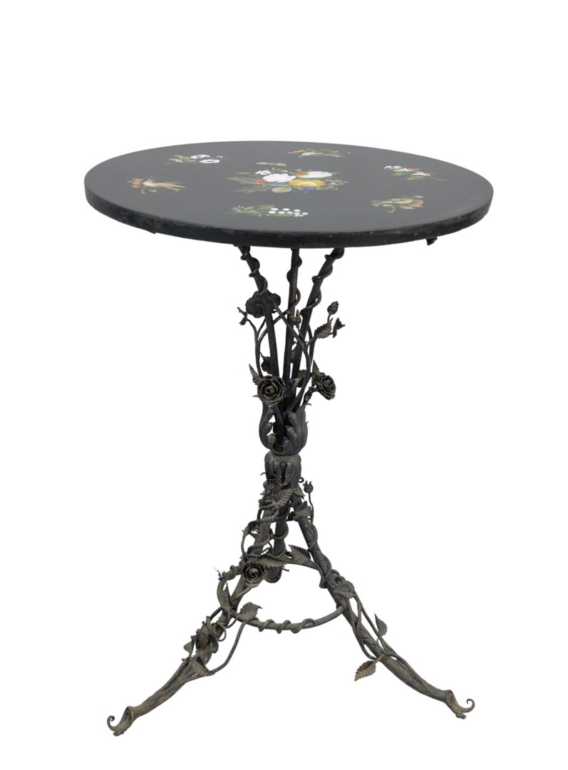having Victorian iron base, top inlaid with birds and flowers