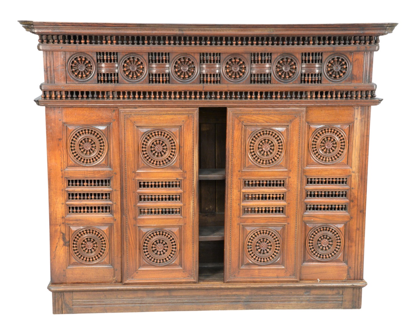 with sliding doors, and carved spindles