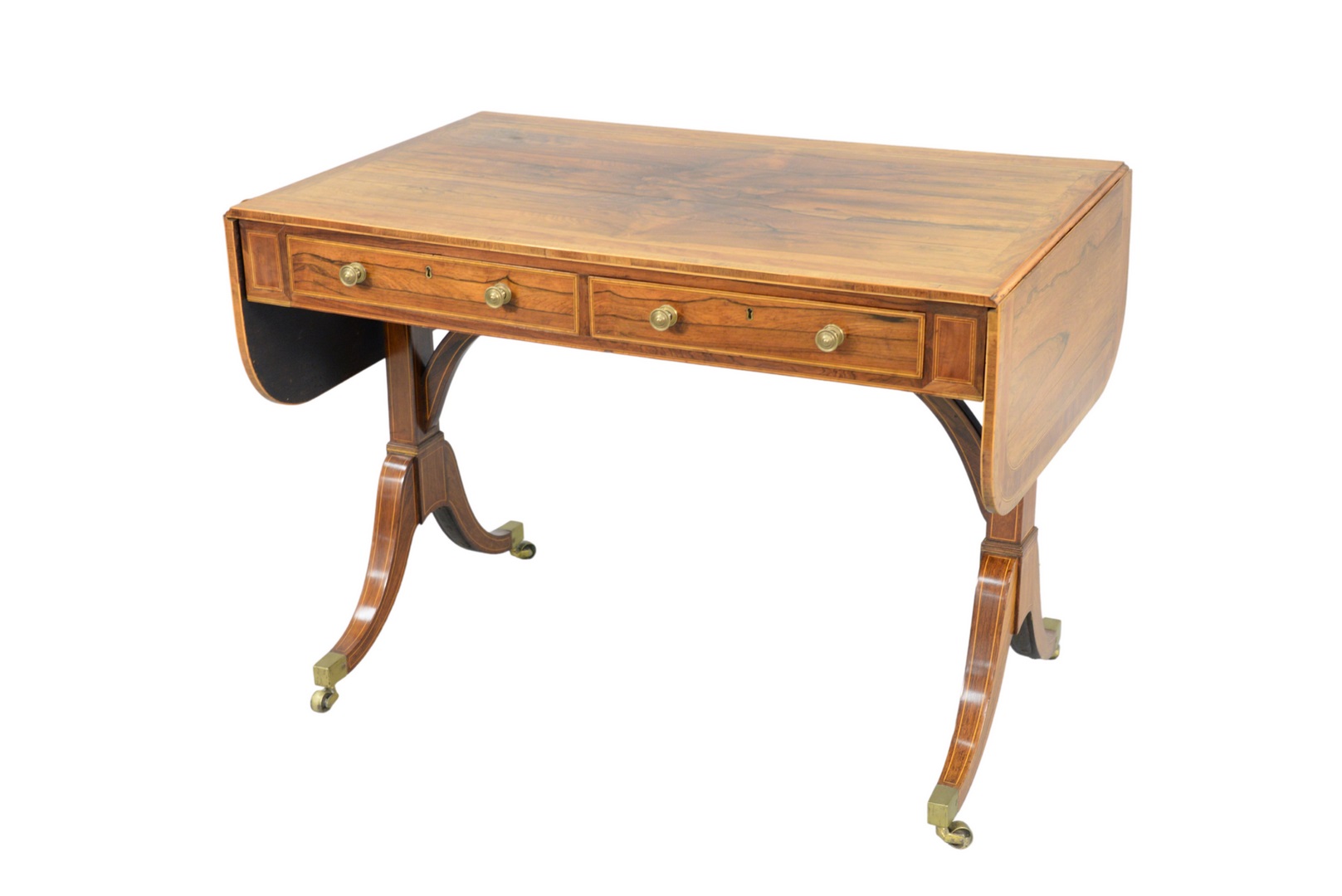 with banded inlaid top and drop leaves, two drawers and two false drawers set on four downswept members, with brass capped feet and castors, 19th century