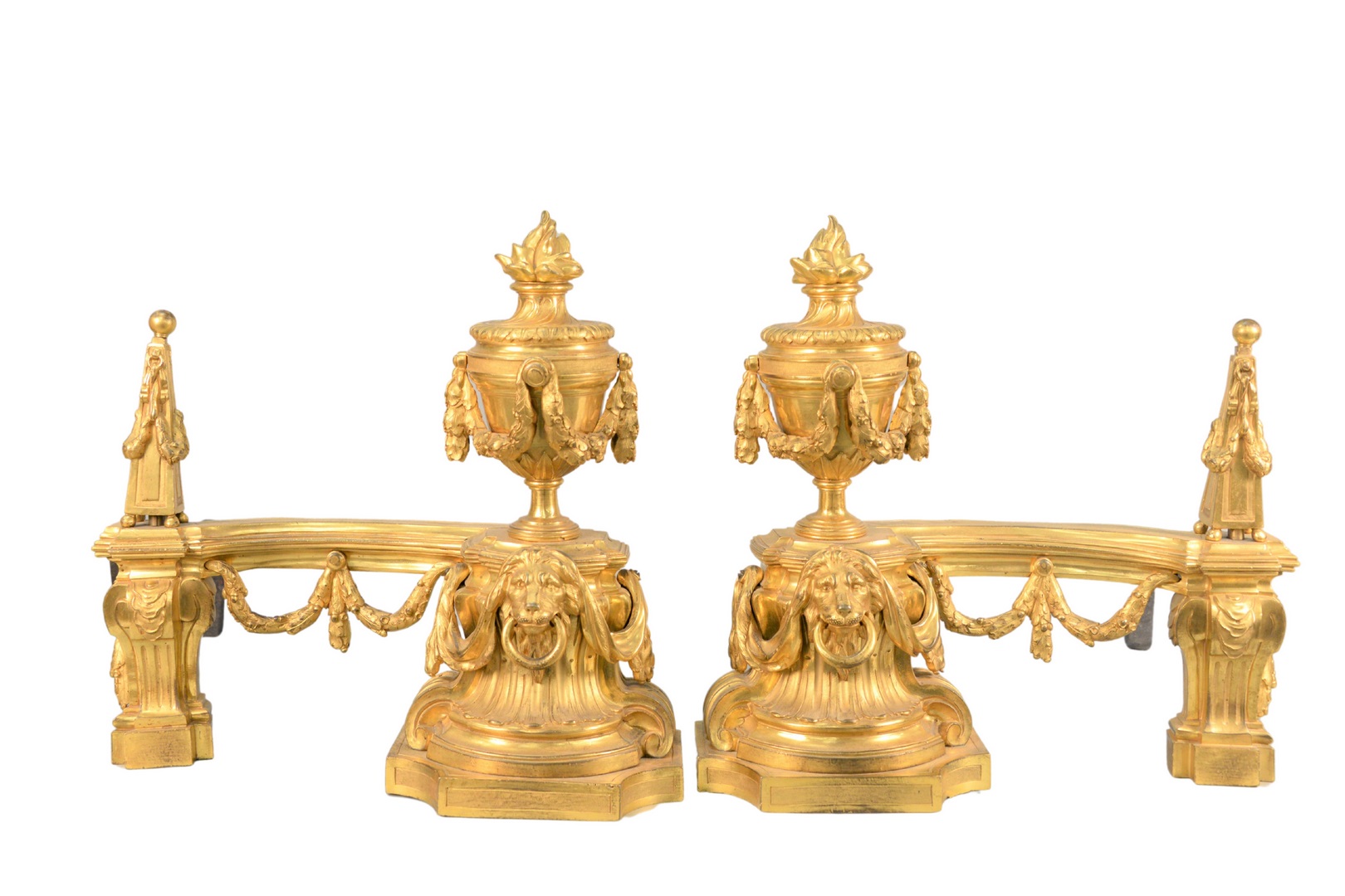 circa 1770, each with flaming urn, and lion’s mask, with berried garland swags