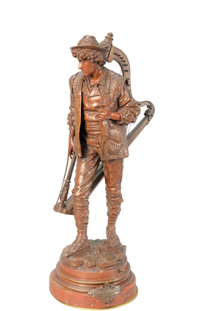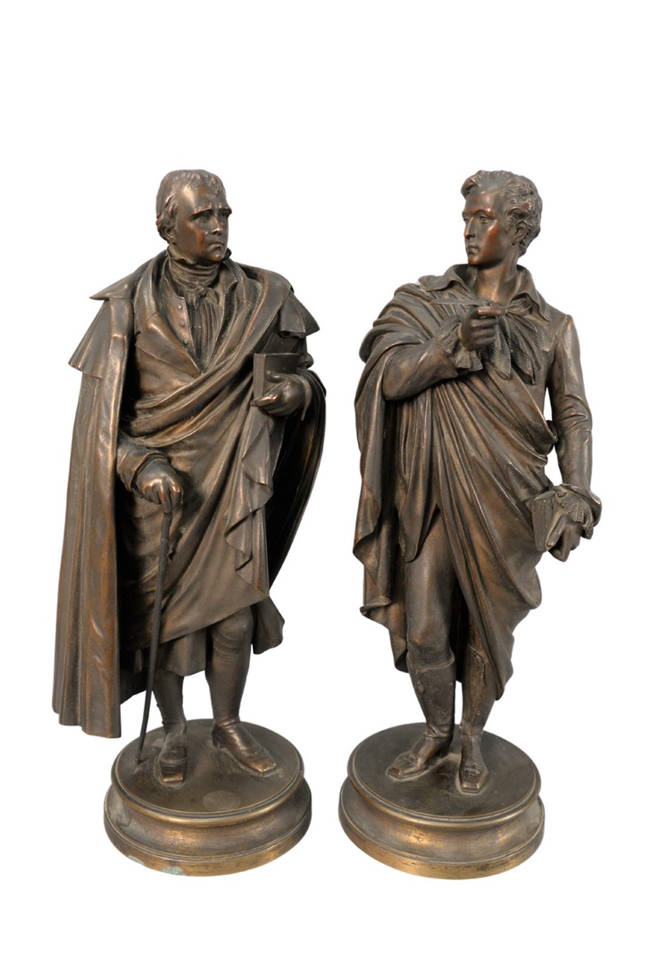 standing figure of a poet holding a book, and a quill pen, along with a figure of a man holding a book, and a cane, on round base